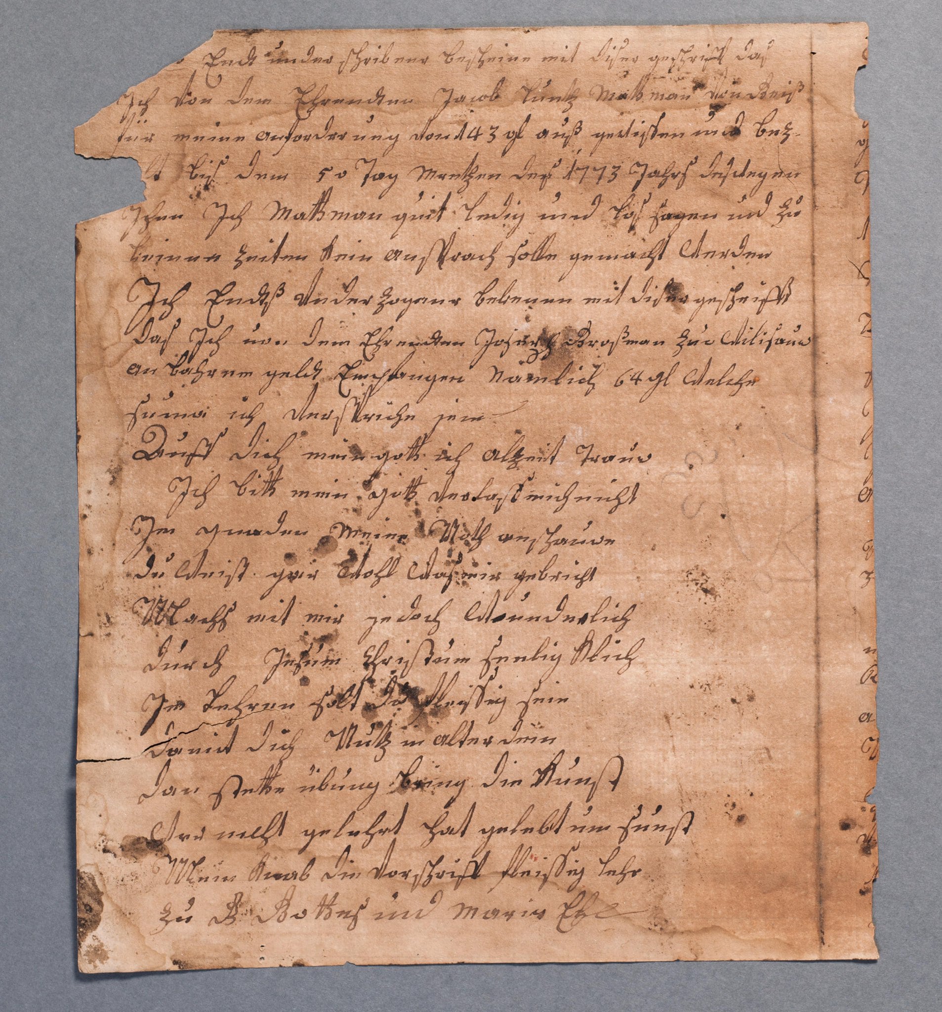 Originales, einseitig geschwärztes Unterlagepapier als Makulatur (Gebet und Schreibübungen, mit den Namen Jakob Grossmann zu Willisau und Jakob Mathman), mit Wasserzeichen (kronehaltende Löwen: evtl. Papiermühle Bremgarten/AG?).