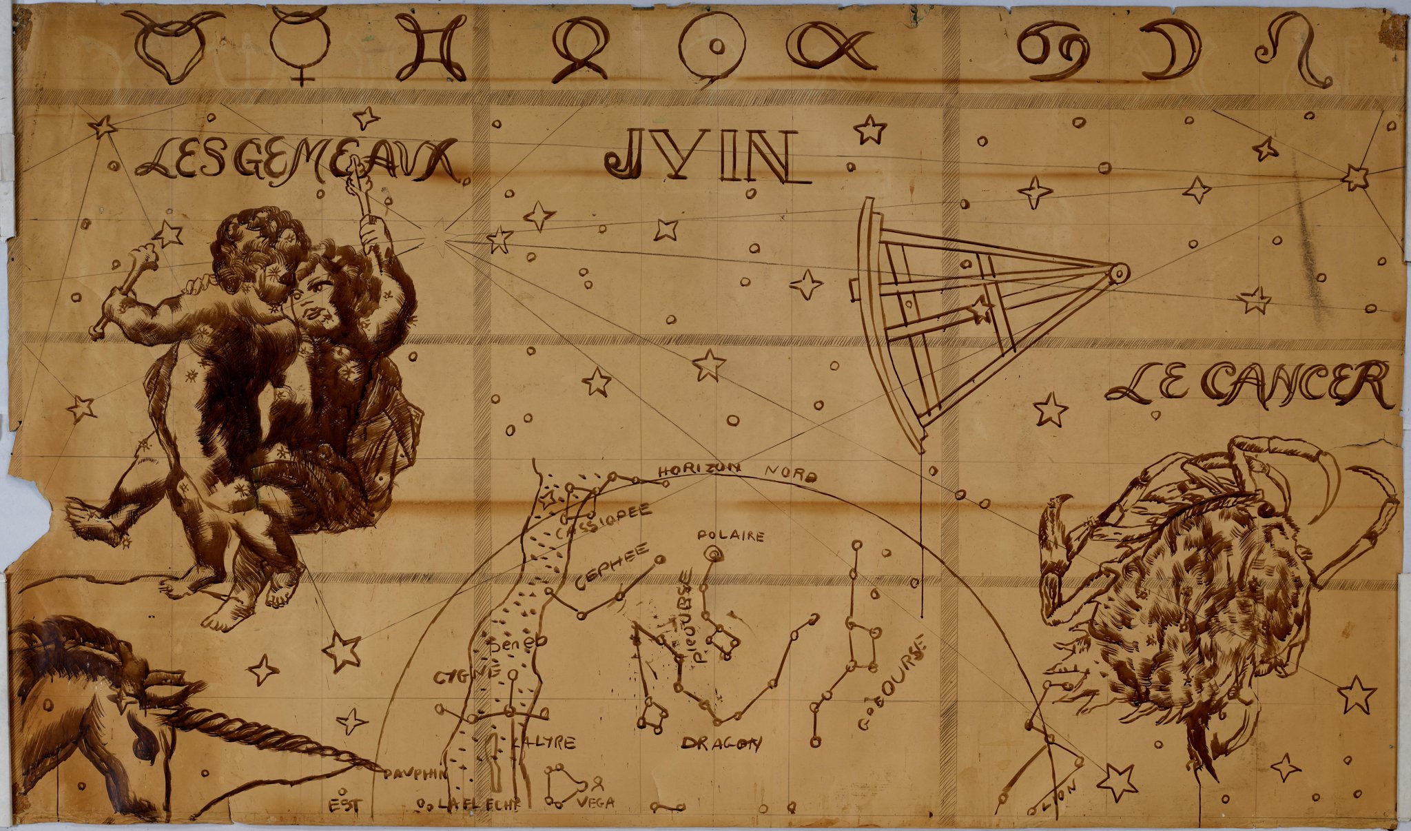Carte du ciel avec au recto le Verseau, l'Aigle et les Poissons en couleur et au recto la Licorne, les Gémeaux, le compas et le Cancer en noir et blanc.