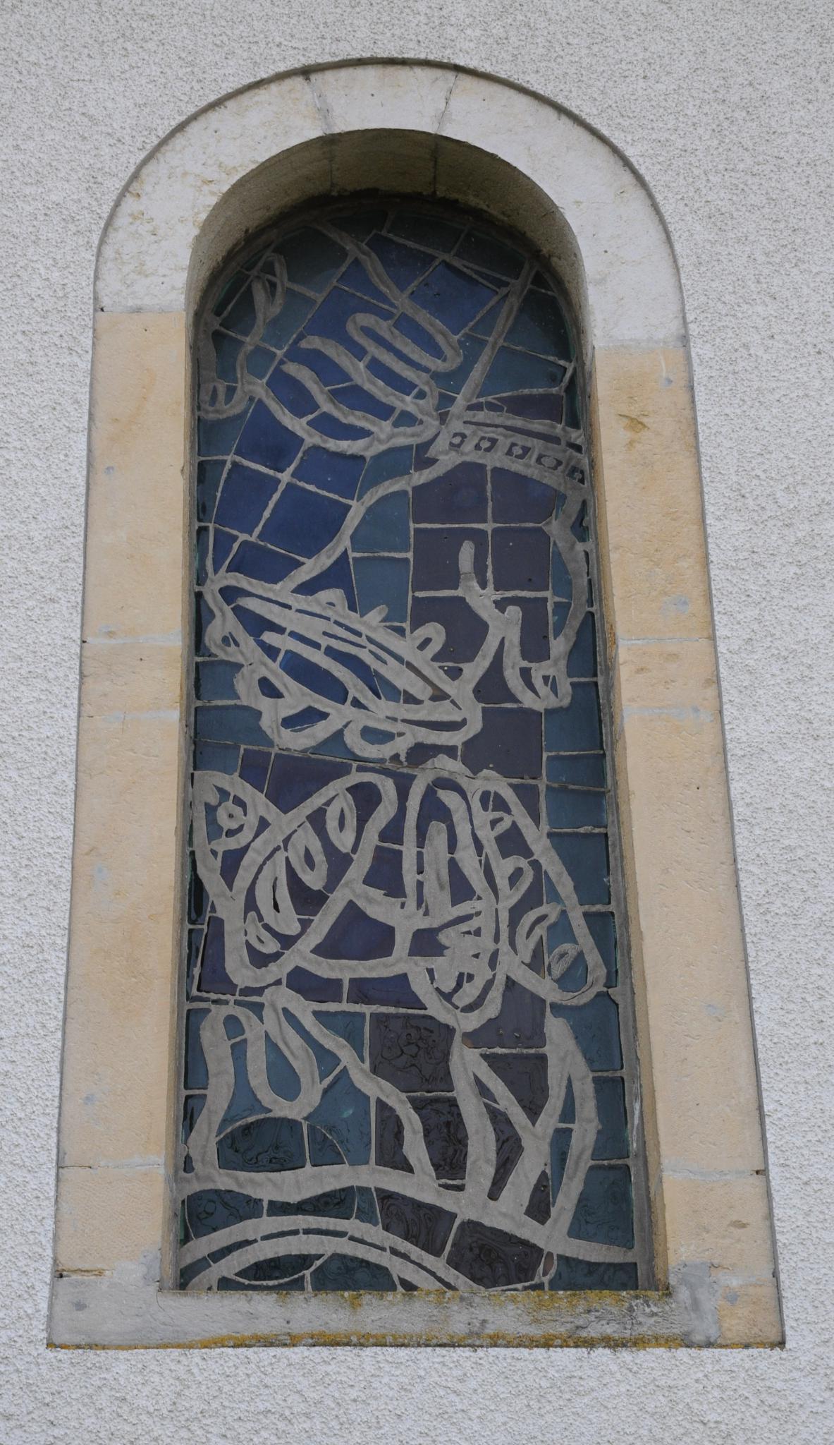 Vue externe de la Multiplication des Pains, vitrail réalisé par Fernand Léger pour l'église de Courfaivre (Jura)