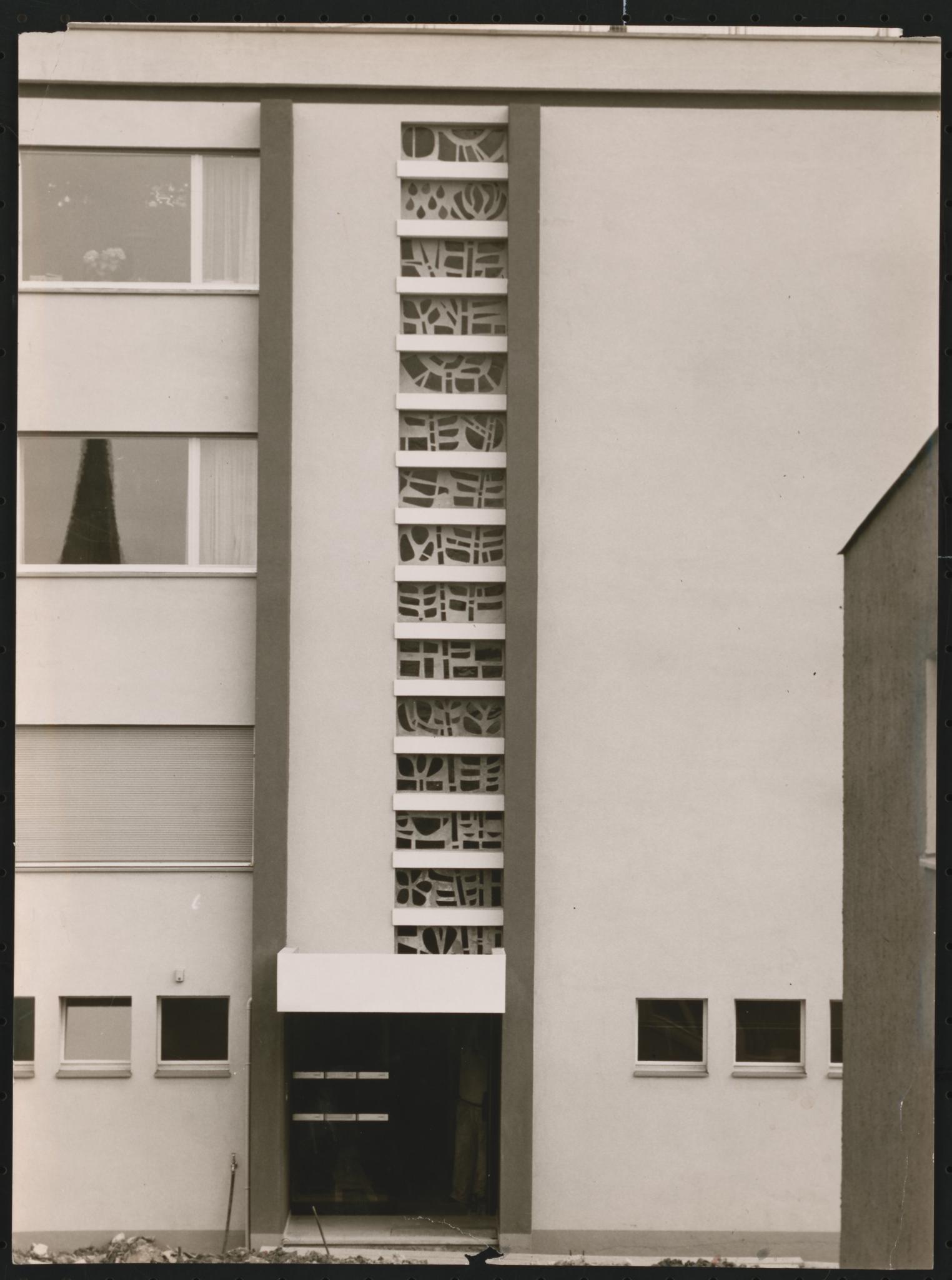 Historische Aufnahme Wohnhaus Spiltrücklistrasse, St. Gallen-St. Georgen, mit einer vertikalen Betonverglasung von Heinrich Stäubli
