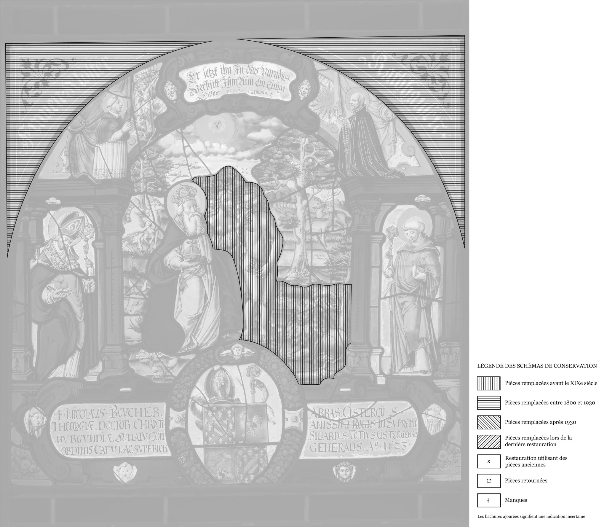Schéma du vitrail aux armes de Nicolas II Boucherat, abbé de Cîteaux, avec Adam et Eve dans le jardin d’Eden