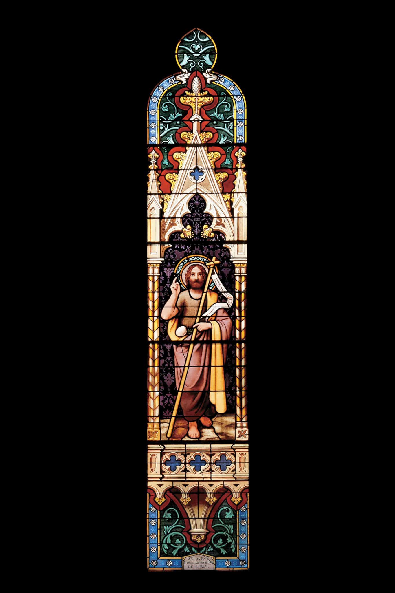 Saint Jean-Baptiste tient une crosse au sommet cruciforme. A sa ceinture, il porte la coquille du pèlerin.