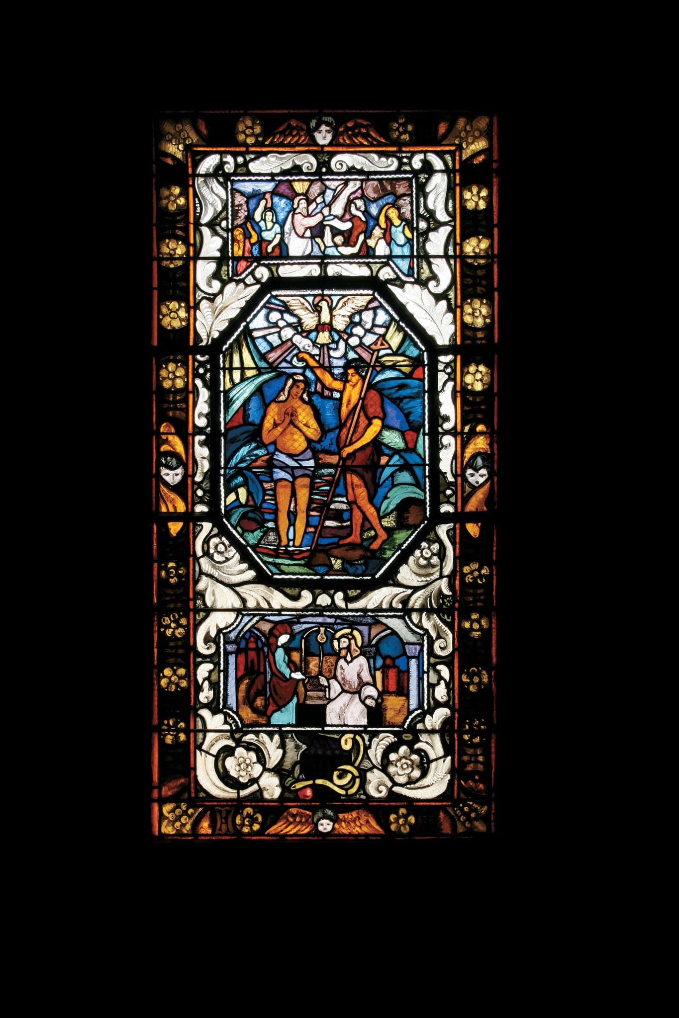 Sur la scène centrale, Jean-Baptiste baptise le Christ debout dans le Jourdain, alors que la colombe du Saint-Esprit descend sur lui. La scène inférieure représente le Christ, assis au bord d’un puits, parlant à la Samaritaine. Les trois parties narratives sont encadrées de motifs ornementaux de palmettes et de fleurs stylisées, traitées en verre clair. Le tout est délimité par une bordure ornée de rosettes superposées et de quatre têtes d’angelots.