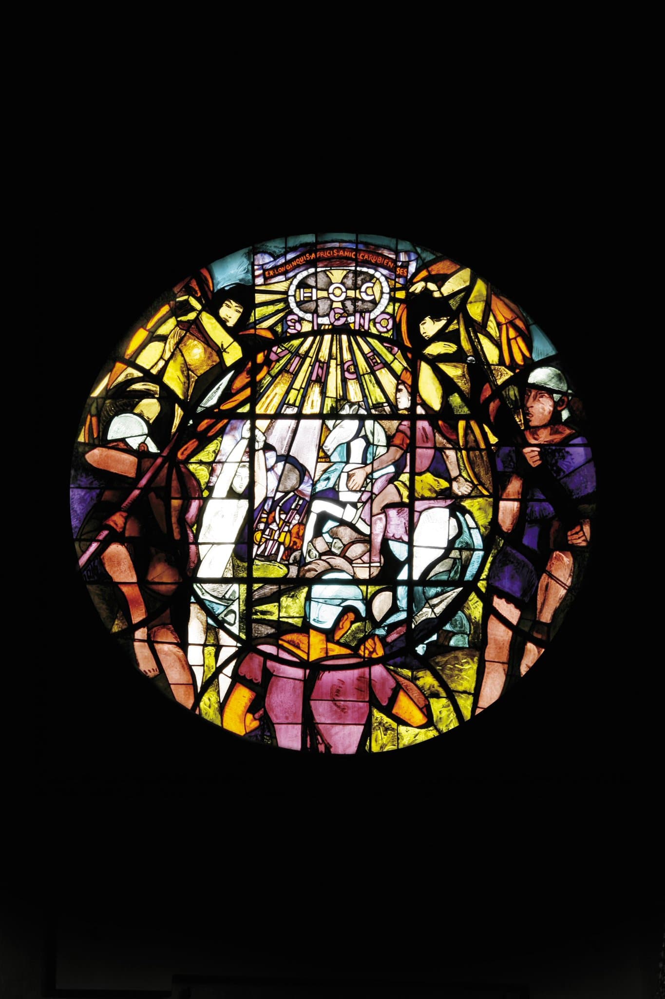 Pour servir cette iconographie originale, Cingria opte pour un style moderne qui caractérise son art, tout en franchissant un pas de plus dans sa compréhension de l’art du vitrail. Dans son ouvrage autobiographique “Souvenirs d’un peintre ambulant”, l’artiste explique avoir compris durant cette période du milieu des années 1920 comment exploiter au mieux les éléments constitutifs du vitrail afin de servir l’expressivité de ses compositions (Cingria, 1933, p. 112-113). Il construit ses vitraux de cette période autour de l’armature métallique, qu’il dispose en formes géométriques autour desquelles s’organise son dessin. On peut notamment évoquer son vitrail de Béatrice soulevée par l’amour (VMR_273), réalisé en 1925 pour l’Exposition des arts décoratifs de Paris, conçu autour de la forme d’un losange horizontal, ou, exemple plus tardif, son vitrail axial de l’église d’Attalens (1938), qui est entièrement composé par des losanges placés verticalement (GSL_40). A Sainte-Croix, en pleine harmonie avec le thème déployé, la structure compose la forme d’une croix pattée autour d’un cercle central. Tantôt il fait suivre à ses personnages la forme évasée des bras de cette croix (comme l’avant-bras du personnage à gauche de la scène de l’Invention de la croix, ou l’ange de droite du vitrail de la Victoire de Constantin dont la ligne du cou est du bras est dessinée par celle-ci), tantôt il choisit de disposer ses motifs librement autour de l’armature.