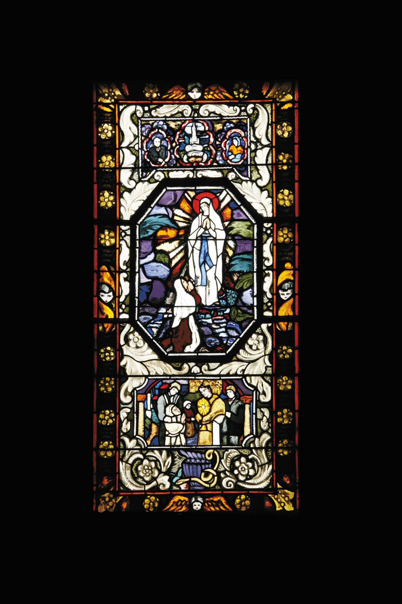 Vitrail de format rectangulaire composé de trois parties figurées superposées. En haut, on trouve les portraits en buste de Bernadette Soubirous et d’un prêtre, de part et d’autre de la représentation de la Basilique de Lourdes. Au centre, la Vierge apparaît à Bernadette Soubirous, agenouillée à gauche. Sur la partie inférieure, un homme, peut-être un malade, est agenouillé devant un prêtre qui lui présente le calice de l’Eucharistie. Un autre personnage le tient par l’épaule tandis qu’une femme attend à l’arrière-plan. Un quatrième personnage en costume se tient derrière le prêtre.