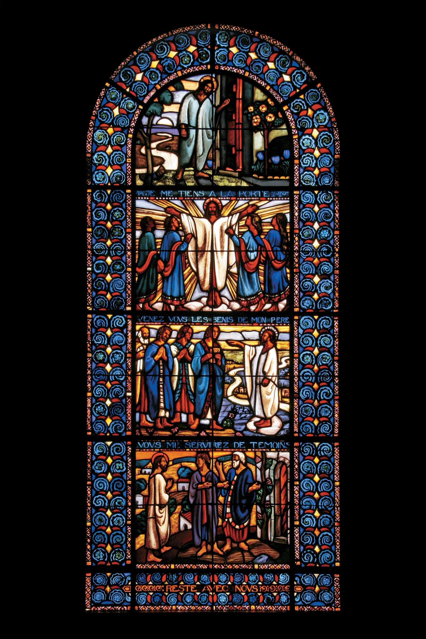 Le Christ frappe à la porte et dit. “Si quelqu’un entend ma voix et ouvre la porte, j’entrerai chez lui et je dînerai avec lui et lui avec moi”. Le Christ en gloire accueille les bénis de son père. Jésus dit aux apôtres qu’ils seront ses témoins à Jérusalem et jusqu’au bout de la terre. Les deux disciples d'Emmaüs invitent le Christ à demeurer chez eux pour la nuit.