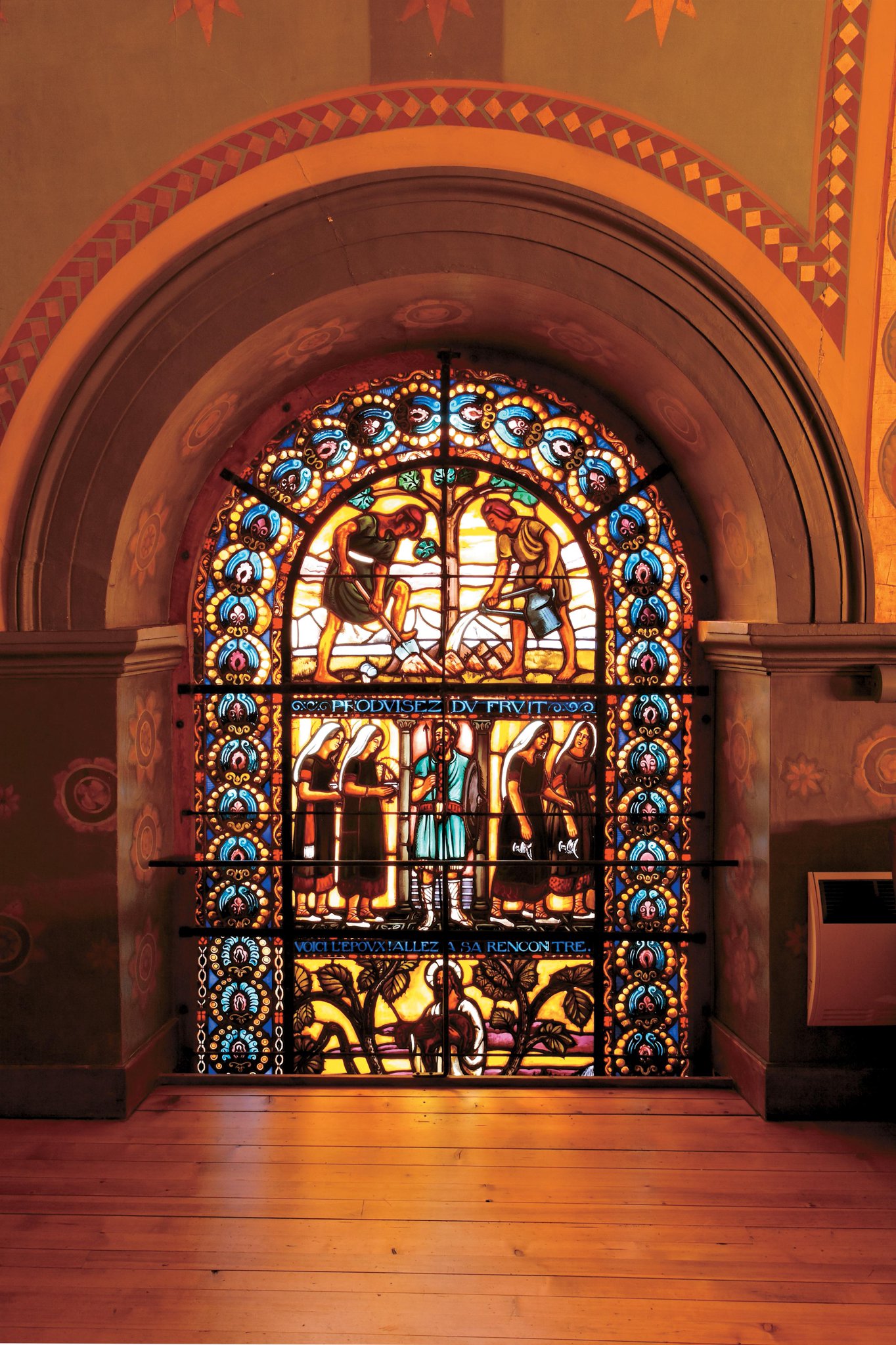 Un homme bêche et l'autre arrose, parabole du semeur semant sur la bonne terre. Les Vierges sages, avec leurs lampes allumées, accueillent l’époux et les Vierges folles, leurs lampes éteintes, partent chercher de l’huile. Jésus en berger donne la vie éternelle à ses brebis. Le maître reçoit les ouvriers lui apportant leur récolte.