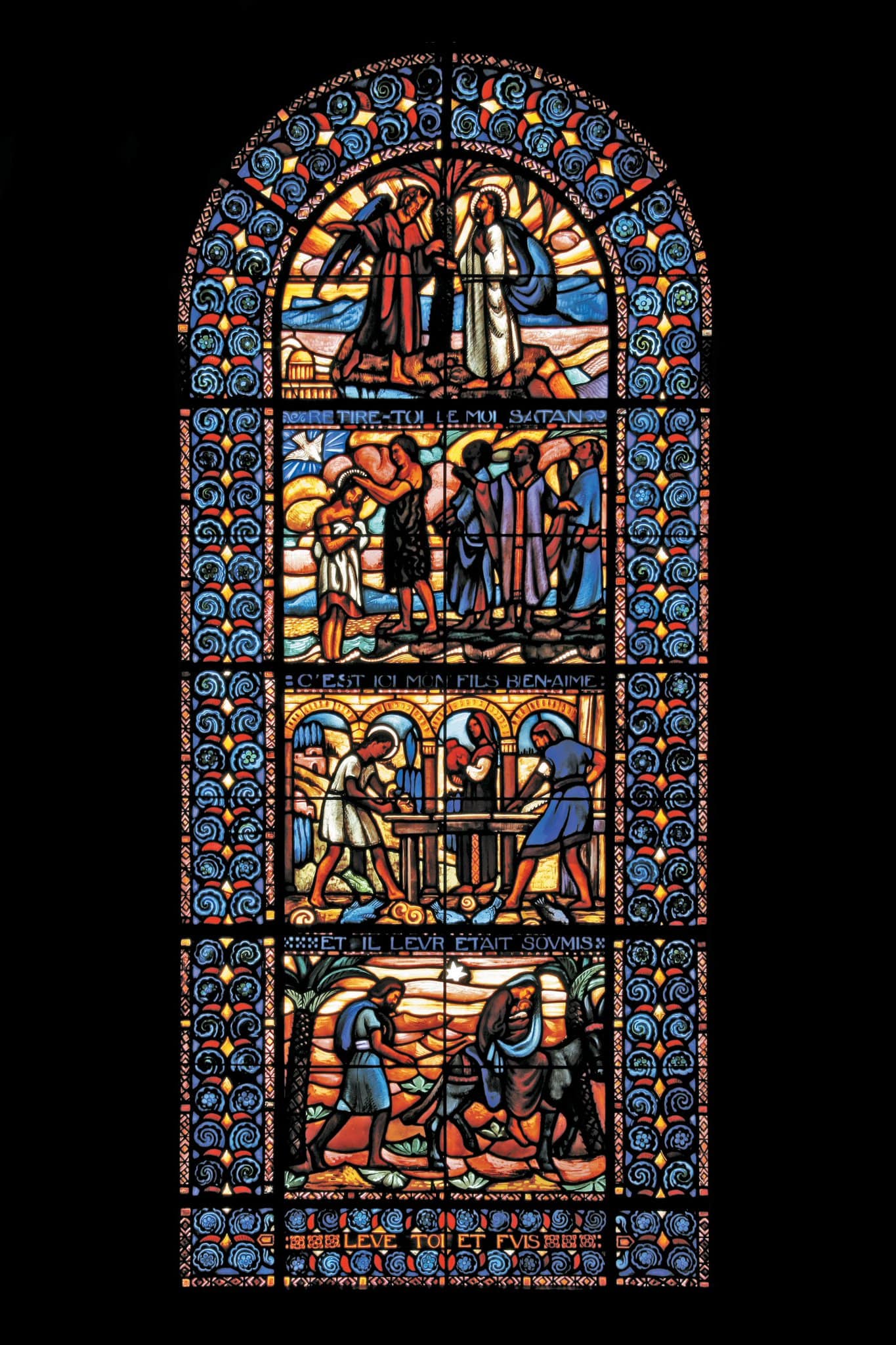 Jésus sur une montagne est face à Satan. Jean baptise le Christ dans les eaux du Jourdain. Jésus travaille avec Joseph et Marie les observe. Jésus, Marie et Joseph fuient vers l’Egypte.