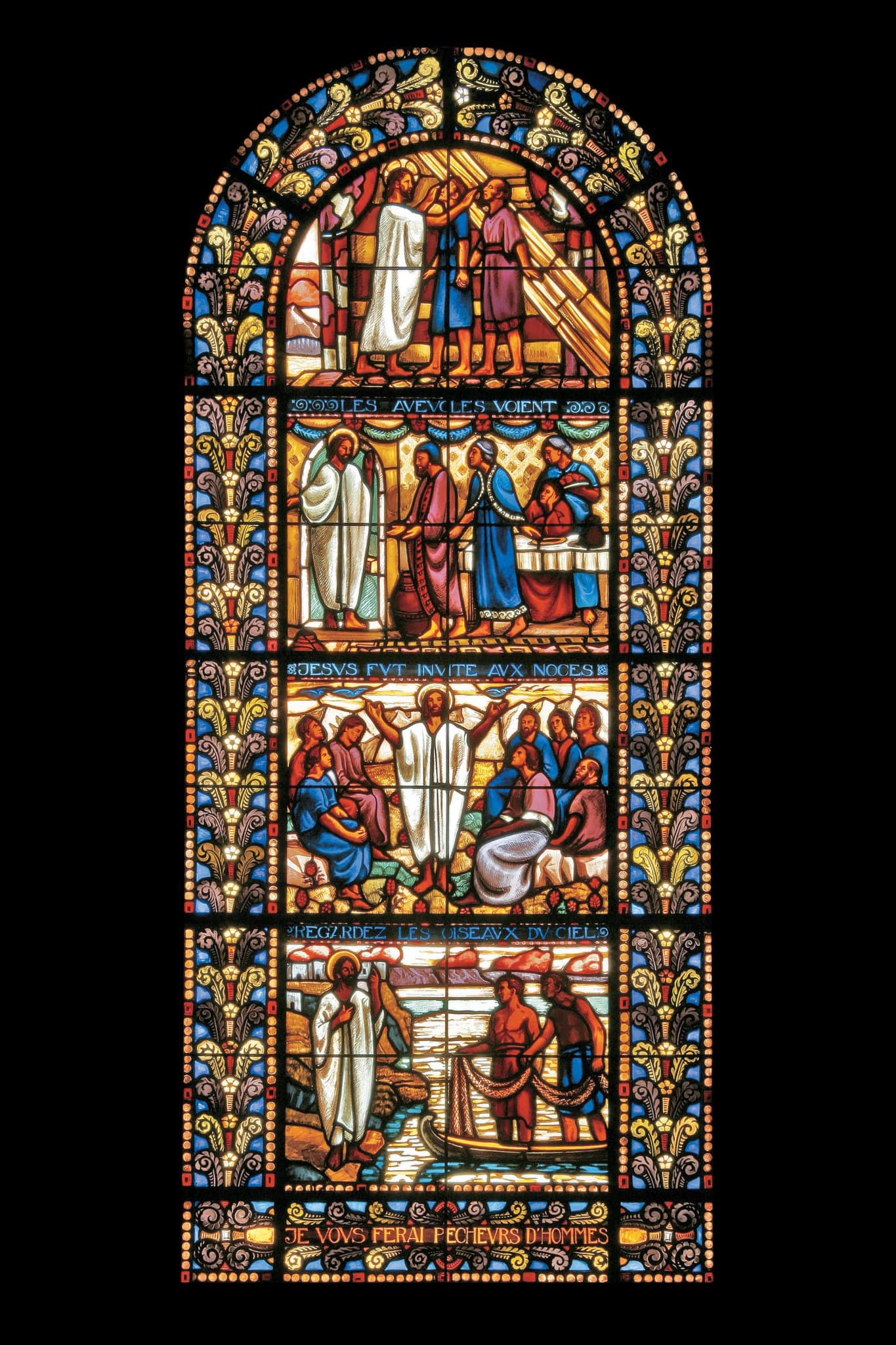 Le Christ guérit deux aveugles en leur touchant les yeux. Jésus est invité aux noces de Cana. Jésus prêche devant ses disciples. Le Christ, au bord du lac, parle à deux pêcheurs dans leur barque, c’est Pierre et André.