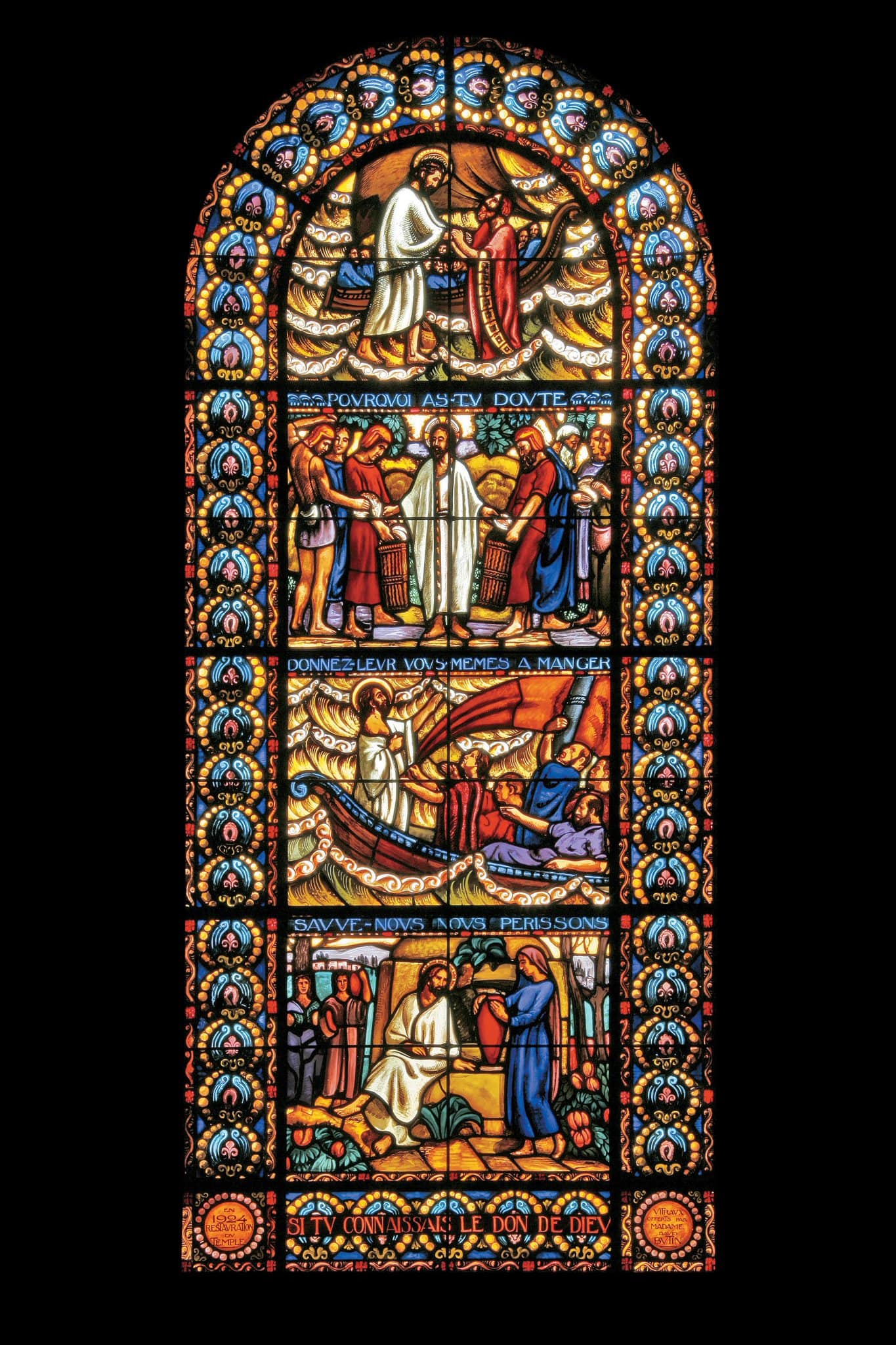 Jésus marche sur l’eau et retient Pierre qui s’enfonce dans l’eau. Jésus distribue le pain multiplié. Le Christ, debout dans une barque avec ses disciples, calme la tempête. Jésus, assis au bord du puits, parle à la Samaritaine.