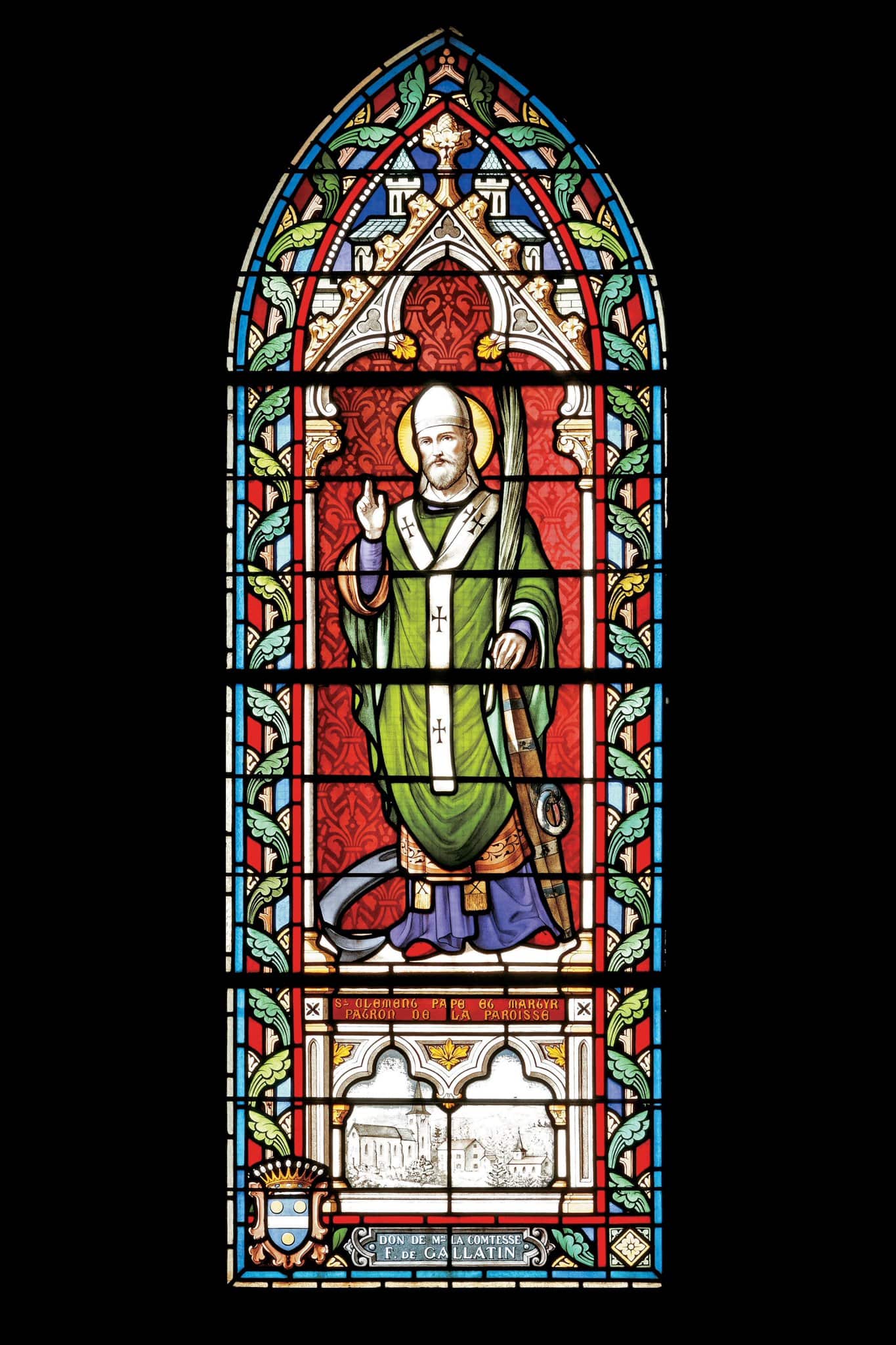 St CLEMENT PAPE ET MARTYR / PATRON DE LA PAROISSE (au pied du saint) / DON DE MME LA COMTESSE F. DE GALATIN (cartouche en bas)