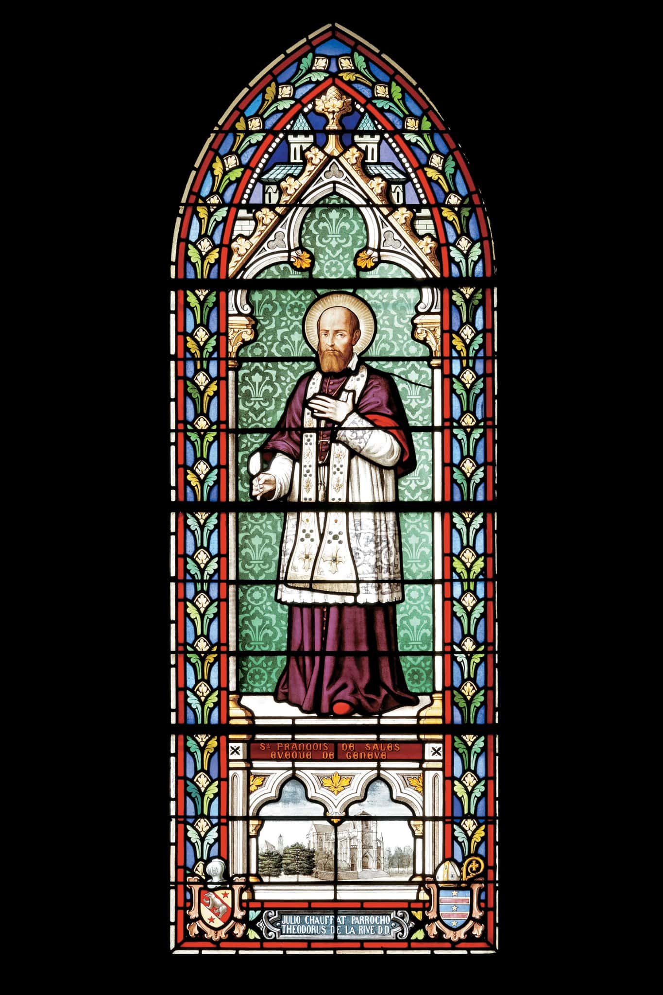 St FRANCOIS DE SALES / EVÈQUE DE GENEVE (au pied du saint)/ JULIO CHAUFFAT PARROCHO / THEODORUS DE LA RIVE D. D. (cartouche en bas)