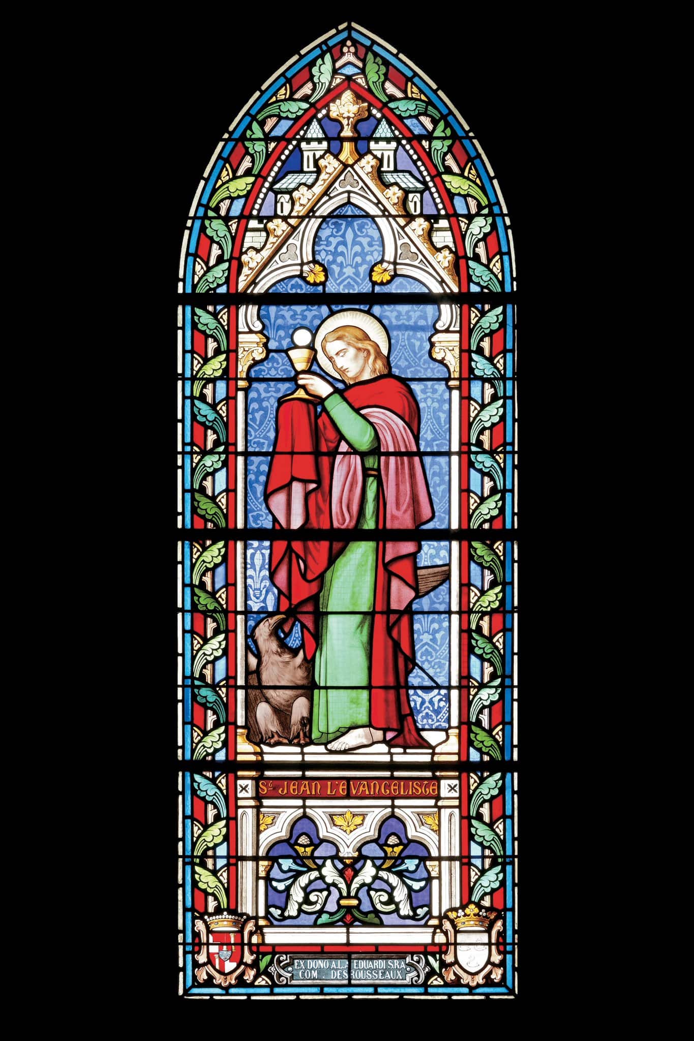 St JEAN L’EVANGELISTE (au pied du saint) / EX DONO A.L.A EDUARDI S.R.A / COM. DESROUSSEAUX (cartouche en bas)
