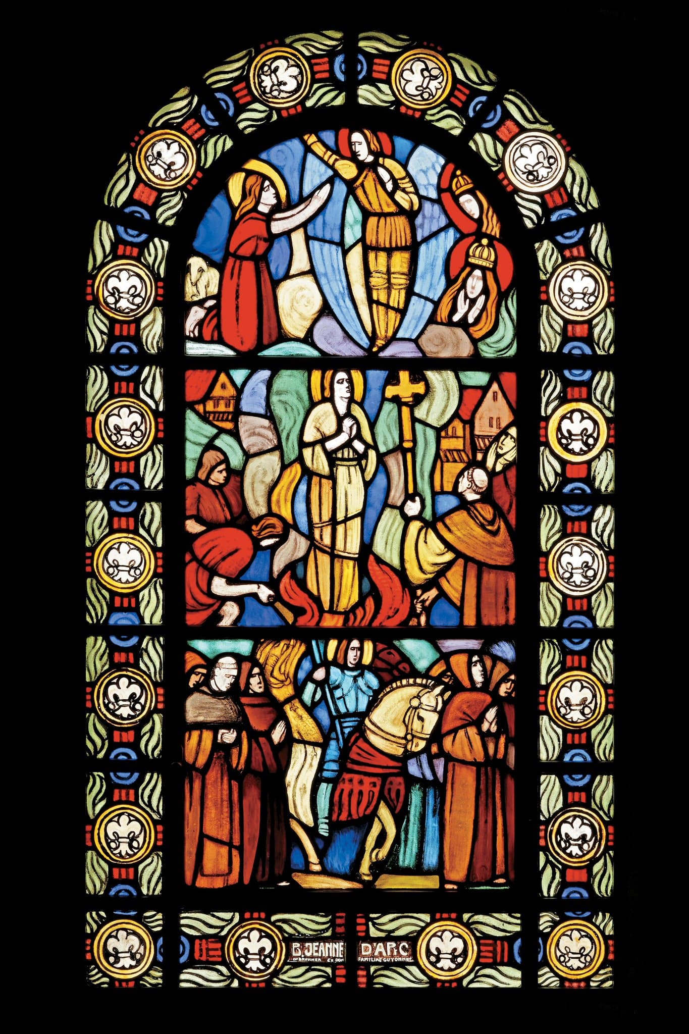 Vitrail en arc en plein cintre composé de trois scènes narratives superposées, encadrées d’une large bordure décorative. Dans la partie supérieure, Jeanne d’Arc, les mains tendues en prière, est agenouillée devant l’archange Michel, debout au centre, ses ailes ouvertes derrière lui, qui s’adresse à la jeune fille, son bras droit levé au-dessus de sa tête.
