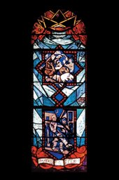 Vitrail en arc en plein cintre composé de deux scènes narratives superposées, disposées chacune dans un médaillon délimité par une fine bordure géométrique rouge, sur un fond bleu. Des motifs ornementaux rouges se déploient sur le haut et le bas du vitrail.