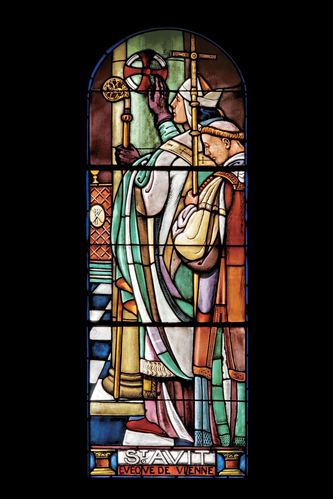 Avit devient évêque de Vienne en 490 et fut évêque métropolitain de Genève, l’Évêché de Genève étant alors dépendant de celui de Vienne. Le jour de la dédicace de la cathédrale Saint-Pierre, Avit est présent pour faire un discours solennel (“Les nouvelles œuvres de Maurice Denis […]”, 1923). Sur le vitrail il consacre Saint-Pierre.
