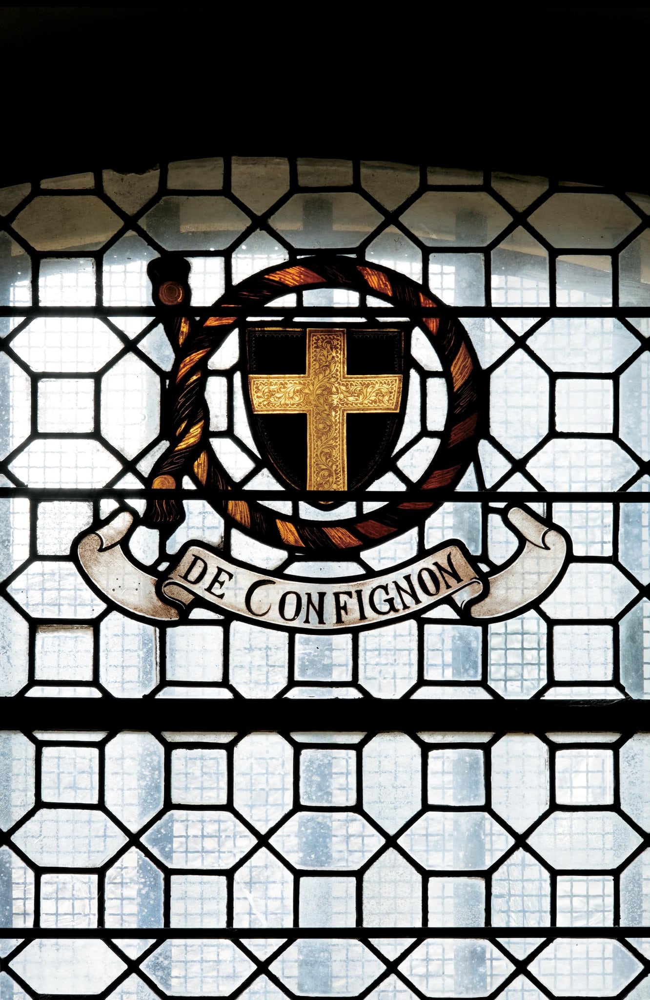 Au sommet du vitrail, les armoiries de la famille de Confignon sont entourées d’un cordon.