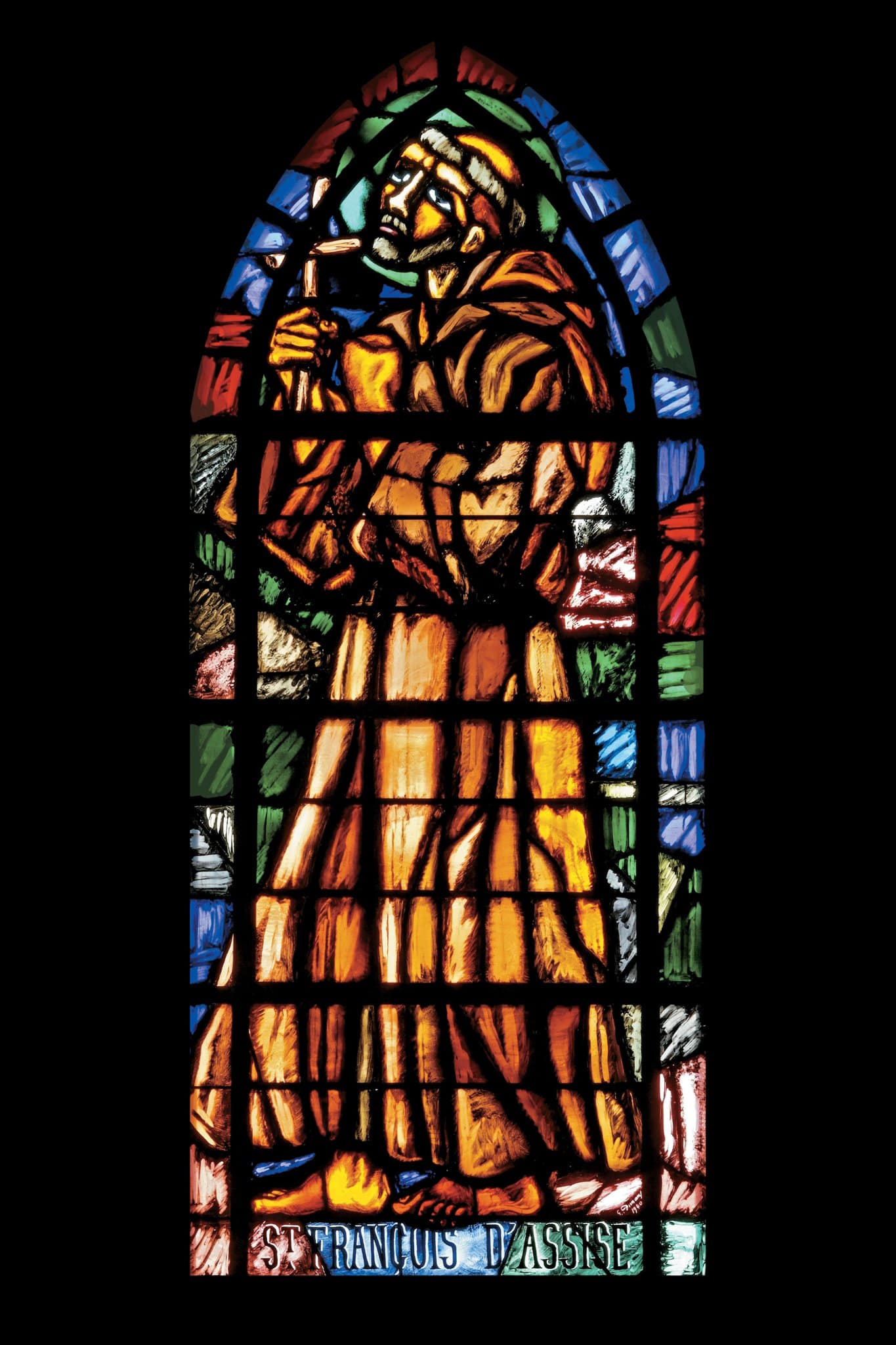 Saint François d’Assise tient un crucifix et regarde vers le ciel.
