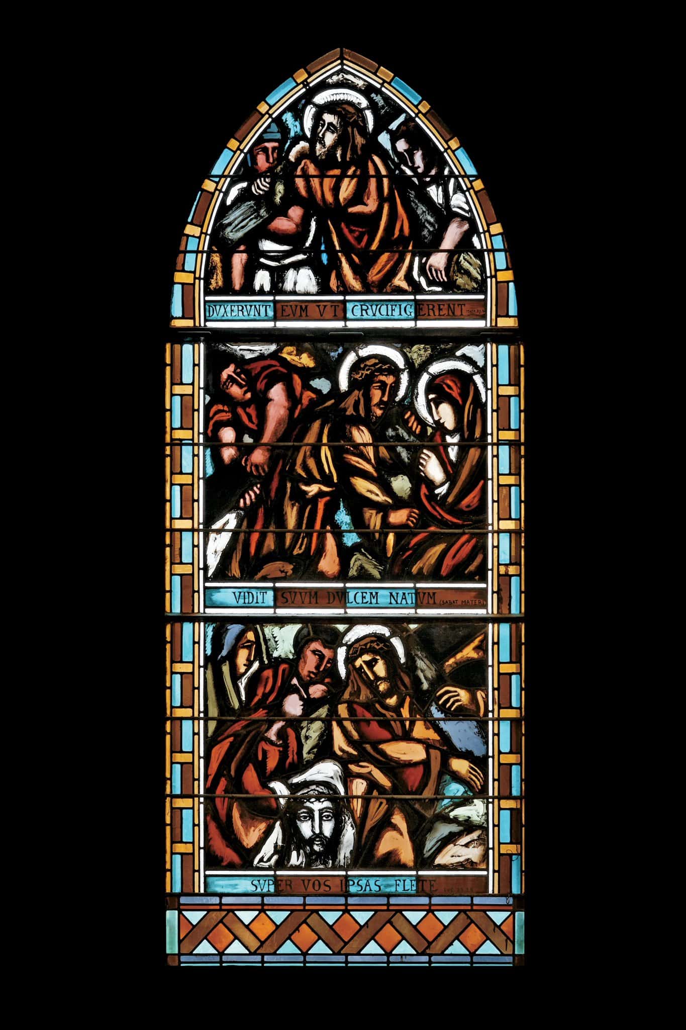 Le Christ porte sa croix, entouré par un soldat et par Simon de Cyrène qui l’aide. Le Christ, sur le chemin de croix, rencontre Marie. Le Christ rencontre les saintes femmes dont sainte Véronique tenant le voile.