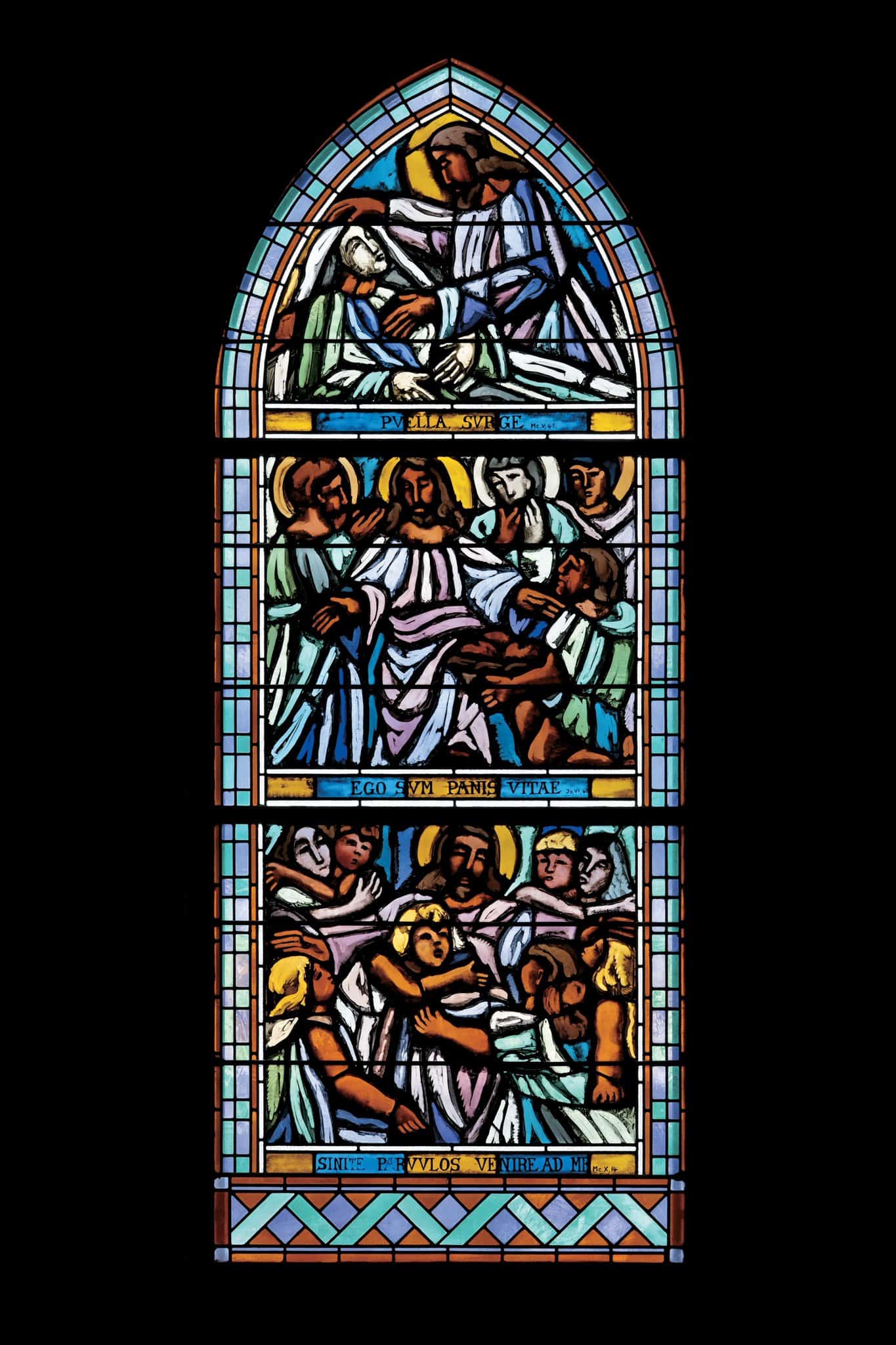 Jésus touche la fille de Jaïre et la ressuscite. Jésus, parmi les apôtres, multiplie le pain et dit: “je suis le pain de la vie”. Jésus dit aux disciples: “laissez venir à moi les enfants”.