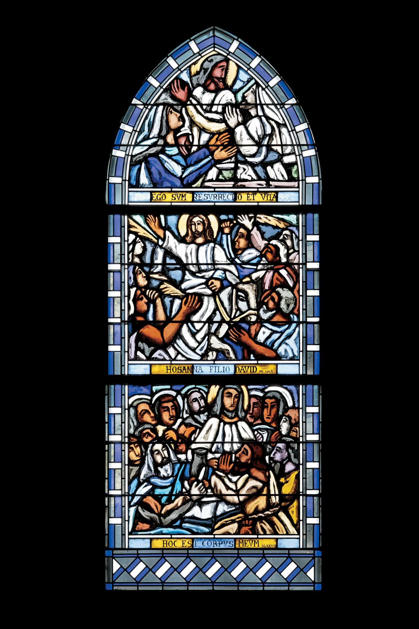 Ego sVm resVrRectio et vita, Jo XI.25 / Hosanna filio David Mt, XXI.9 / Hoc est corpVs meVm, Lc XXII.19 (bandeau sous chaque scène)