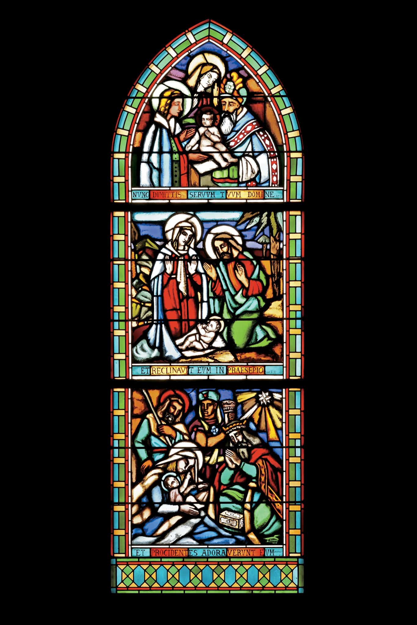 Syméon accueille l’Enfant Jésus au Temple. Marie et Joseph devant l’Enfant Jésus. Les Rois Mages en adoration devant l’Enfant Jésus.