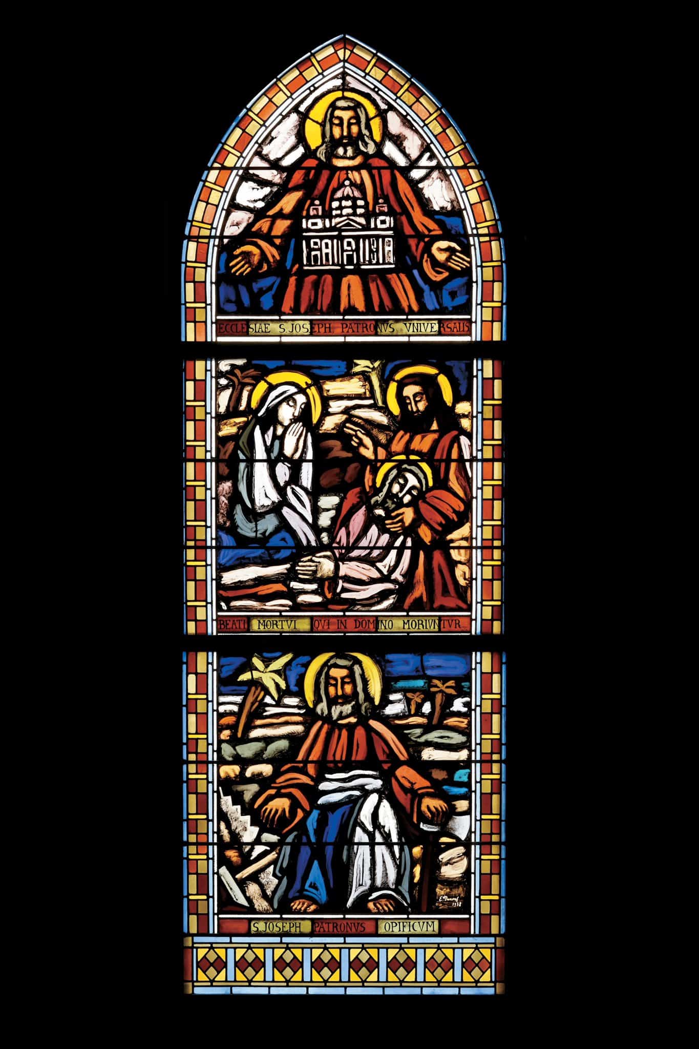 Ecclesiae S. Joseph patronVs Vniversalis / Beati martViri qui in Domino mariVntVr, Apoc. 14.13 / S. Joseph patronus opificum (bandeau sous chaque scène)