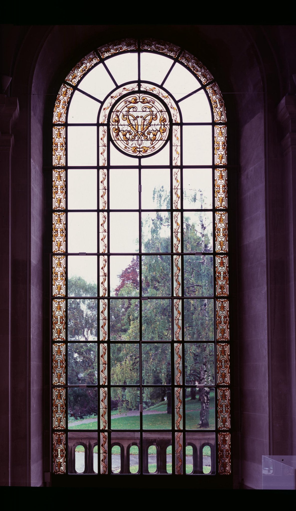 Des motifs végétaux forment un double encadrement avec un médaillon, alors que des verres blancs dominent le reste de la composition.