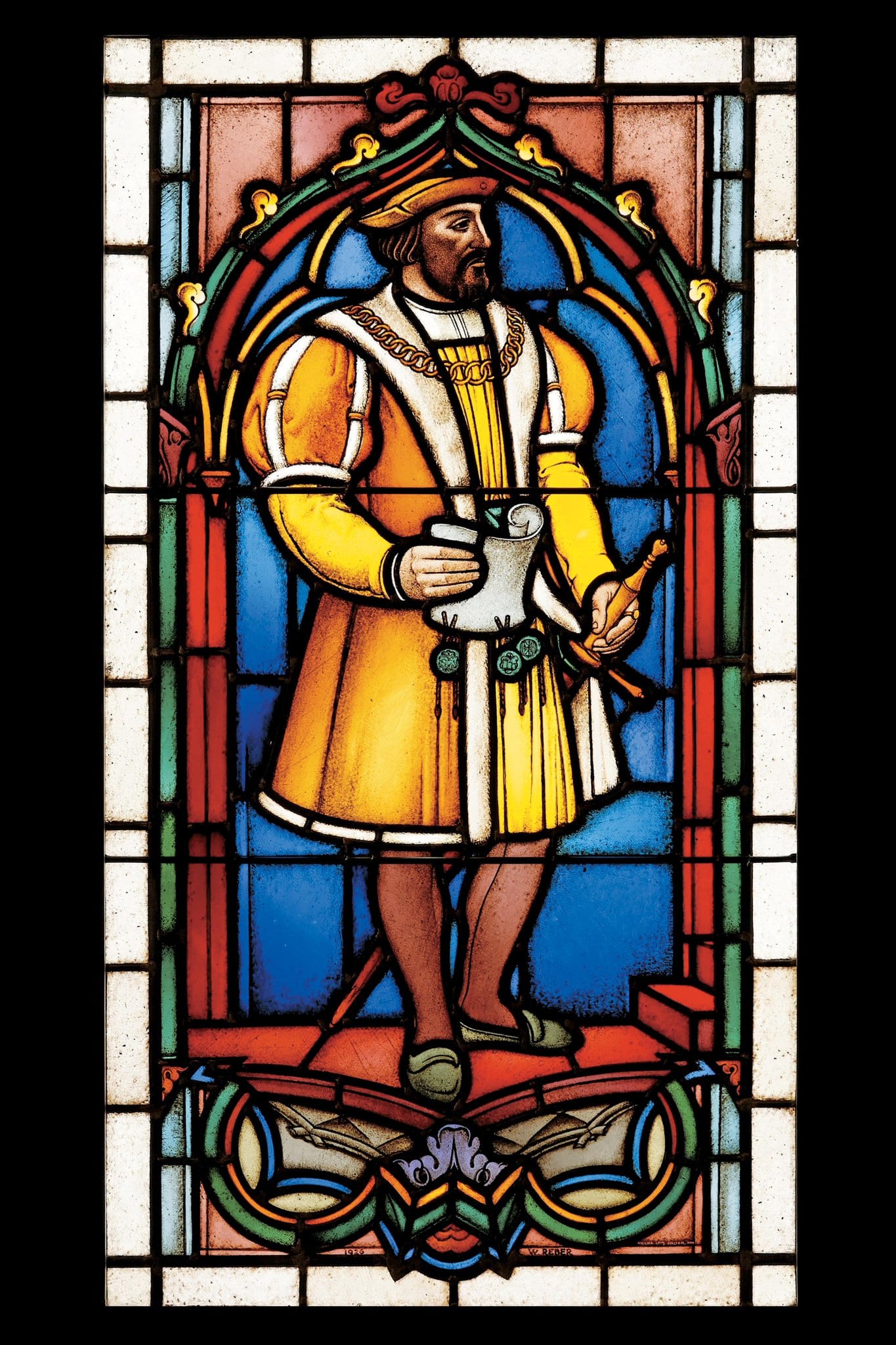 Un messager, en habit du XVIe siècle, tient dans ses mains un parchemin et une épée.