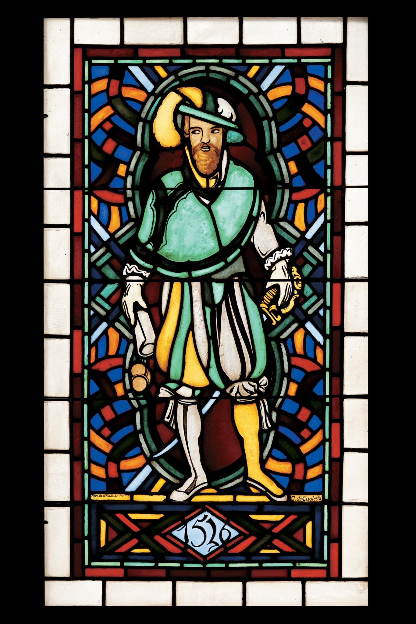 Un messager, en habit du XVIe siècle, tient dans ses mains un parchemin et une épée.