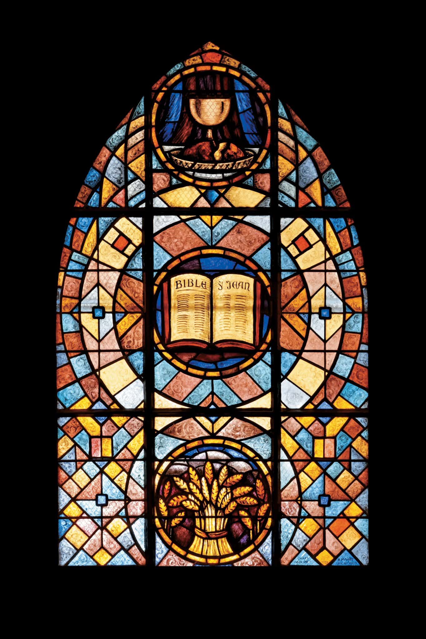 Dans des médaillons, on trouve : en haut, le pain et la coupe de bénédiction de la sainte Cène, au centre la Bible ouverte à l’évangile de saint Jean et en bas, une gerbe d’épis de blé.