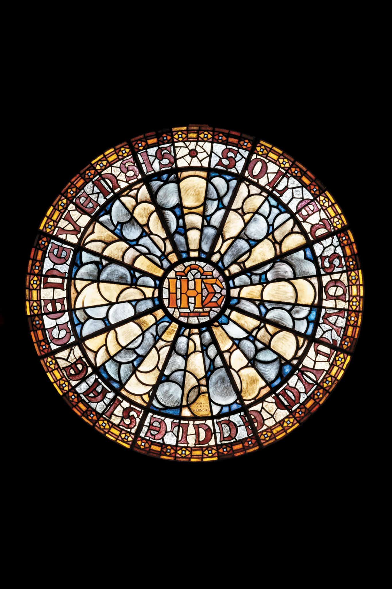 Au centre de la rosace, il y a le monogramme IHS qui rayonne sur le texte, devise de la Réforme genevoise.
