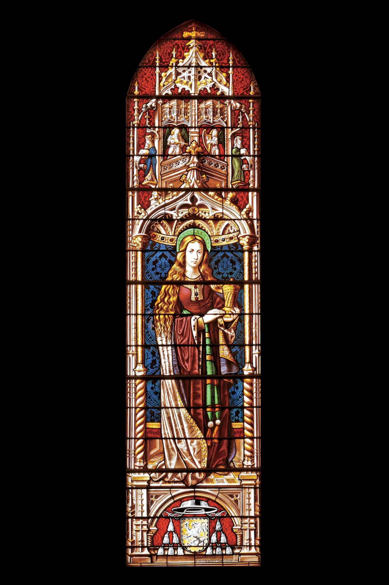 Sainte Marie Madeleine tient un vase à parfum. A ses pieds, les armoiries de la famille de Charansonnex.