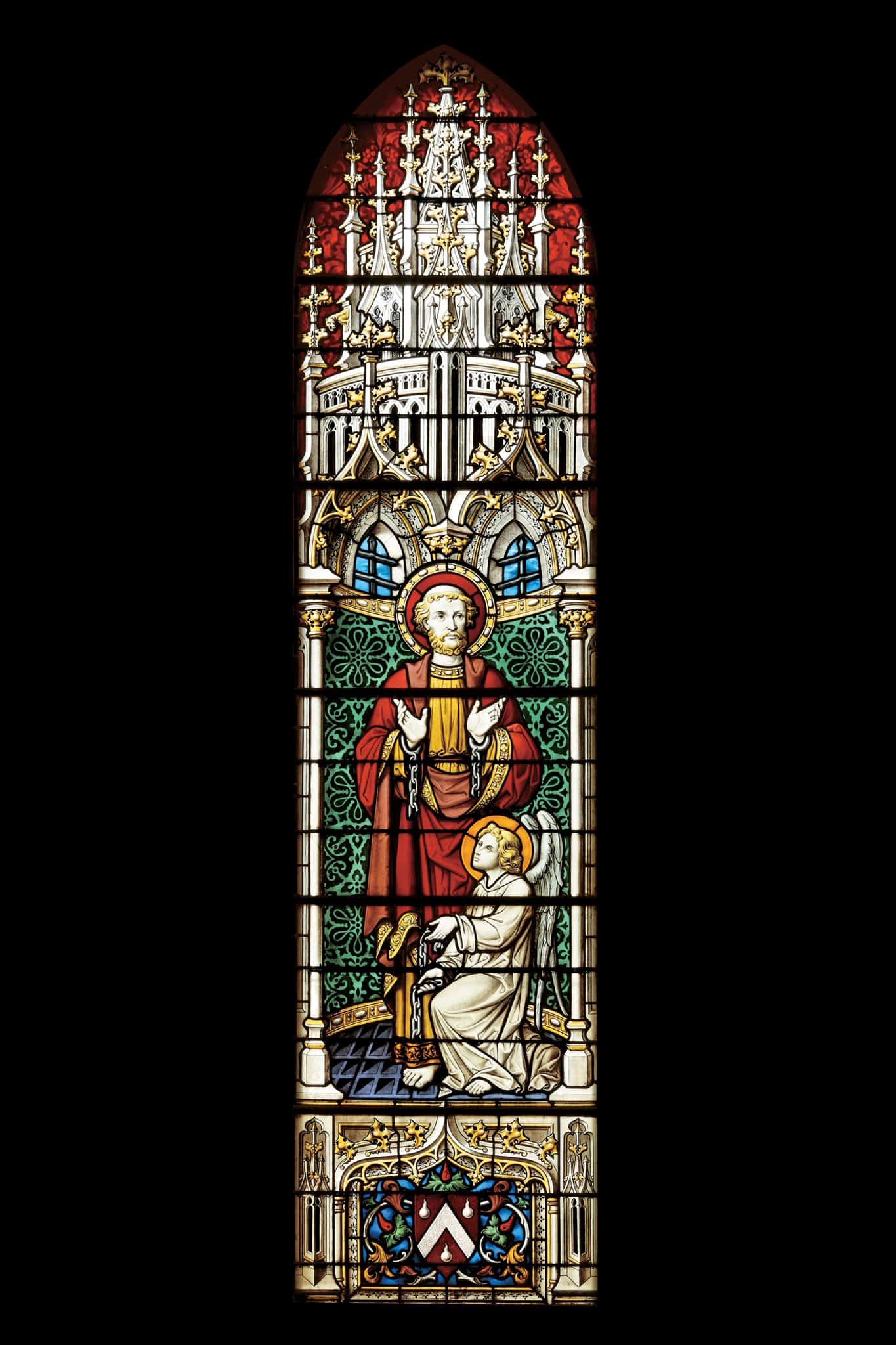 Saint Pierre aux Liens présente ses mains aux chaînes brisées. Agenouillé devant lui, l’ange venant de le libérer tient encore les chaînes. En bas, les armoiries de la famille Desgouttes-Colladon.