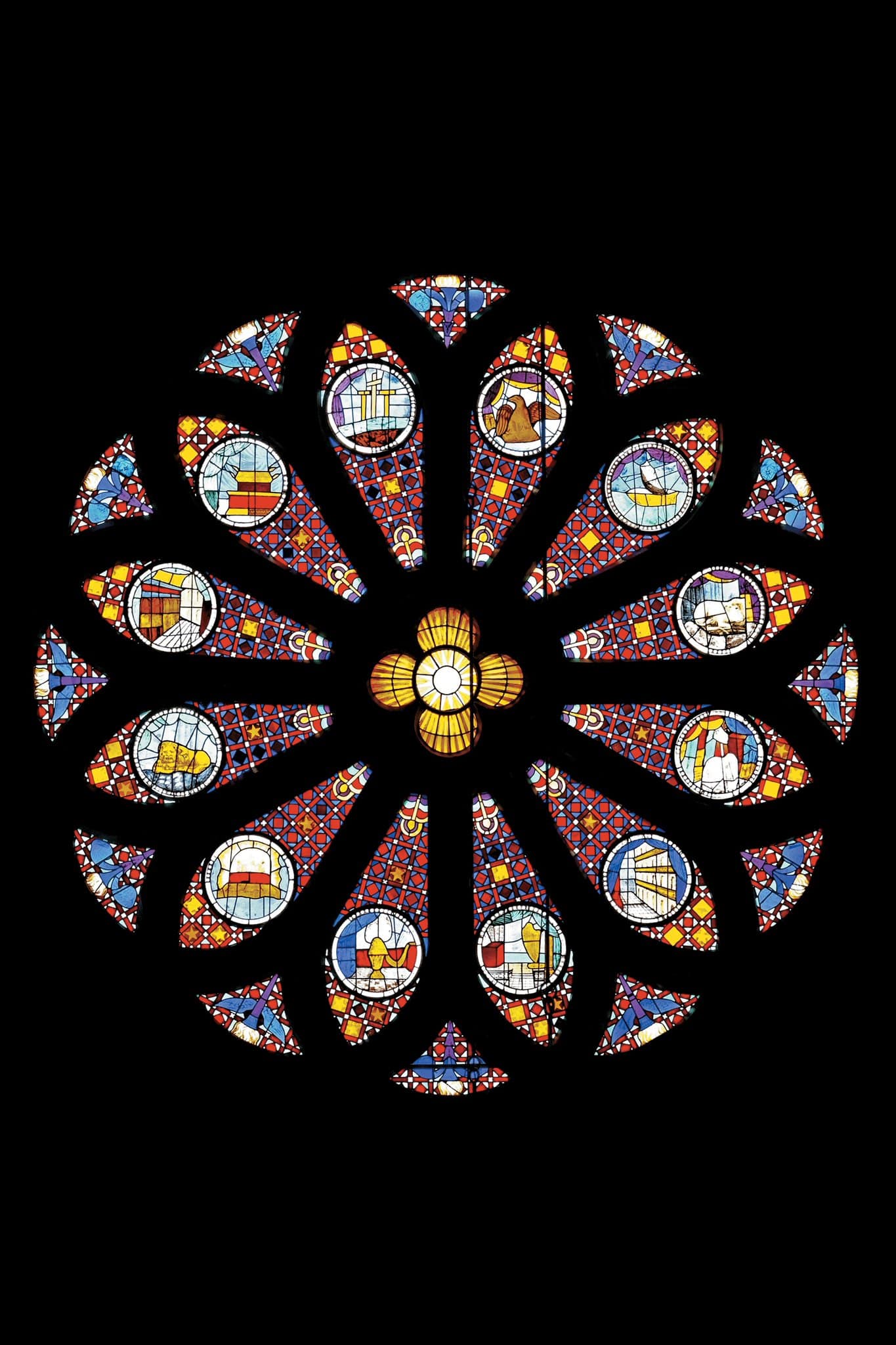 La rose comporte 12 médaillons avec des symboles du Nouveau Testament: les trois croix du calvaire / l’autel des cornes / le temple de Salomon / le lion de saint Marc / la Jérusalem céleste / un encensoir / la harpe et les psaumes / le prétoire / l’ange de saint Matthieu / le boeuf de saint Luc / une barque symbolisant l’Eglise / l’aigle de saint Jean.