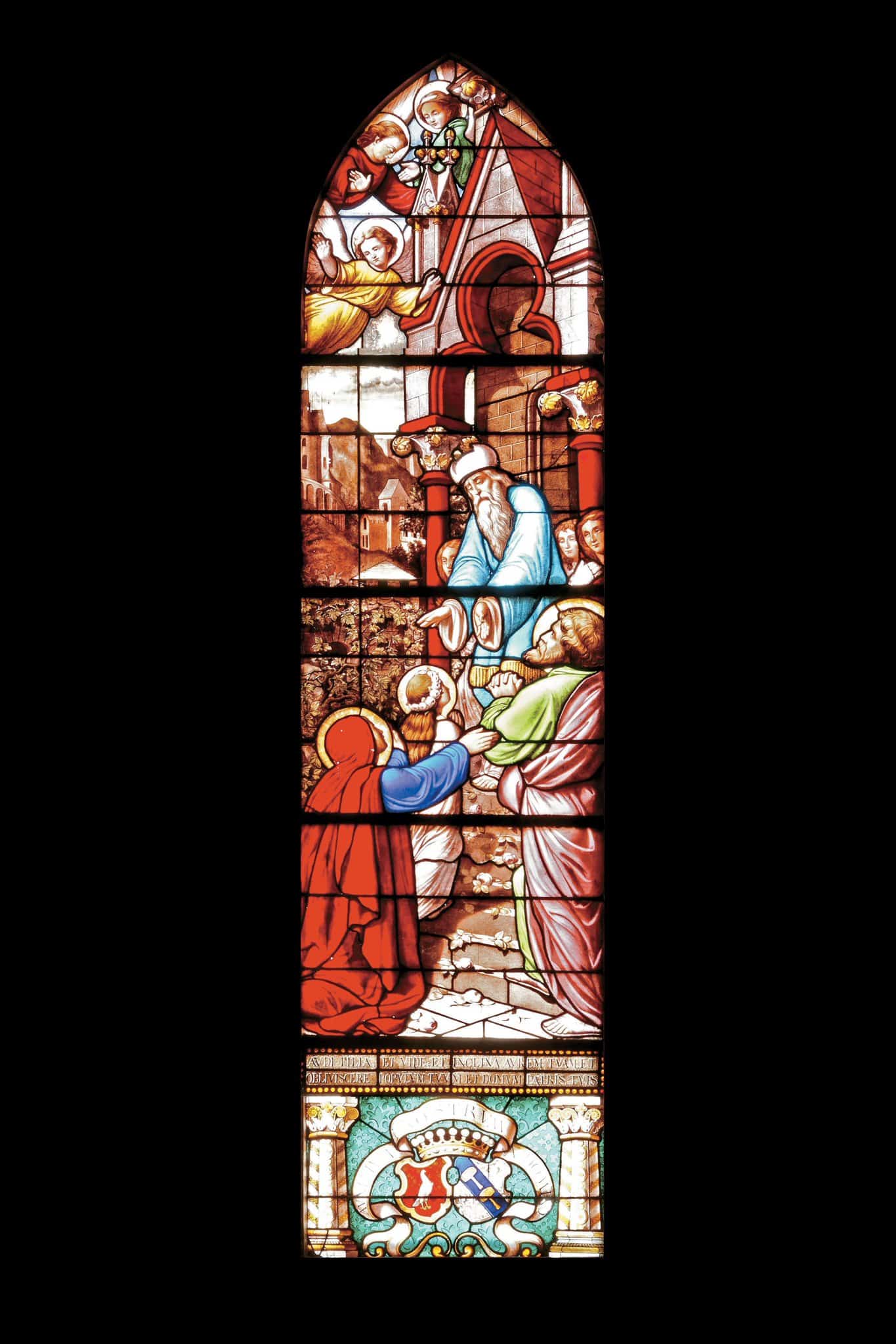 Anne et Joachim amènent Marie sur le parvis du Temple, à l’entrée duquel un prêtre l’attend les bras ouverts. Trois anges dominent la scène. En bas, les armoiries du donateur