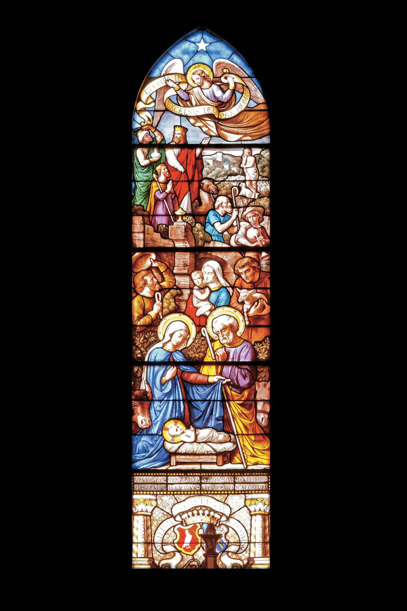 GLORIA IN EXCELSIS DEO PAX HOMINI (banderole de l’ange) / VENITE GENTES ET ADORATE DOMINUM QUIA HODIE / DESCENDIT LUX MAGNA SUPER TERRAM ALLELUIA / AUXILIUM NOSTRUM A DOMINO (cartouche) / FAMILLE FEGELLI-MAILLARDOZ (banderole au-dessus des armoiries)