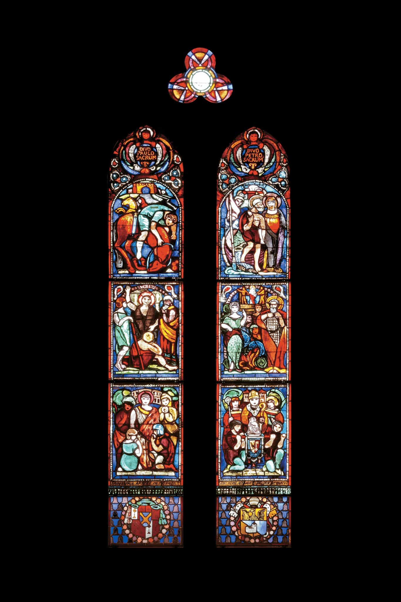 Lancette de gauche: sur le chemin de Damas, Paul est aveuglé par un éclair prodigieux et tombe de sa monture. Sa prédication à Athènes dans l’aéropage. A Rome. saint Paul annonce aux juifs le royaume de Dieu. En bas, les armoiries du donateur. Lancette de droite : Pierre, sur les eaux, appelle Jésus à l’aide. Son reniement. Un évêque devant la cathédrale Saint-Pierre de Genève. En bas, les armoiries du donateur