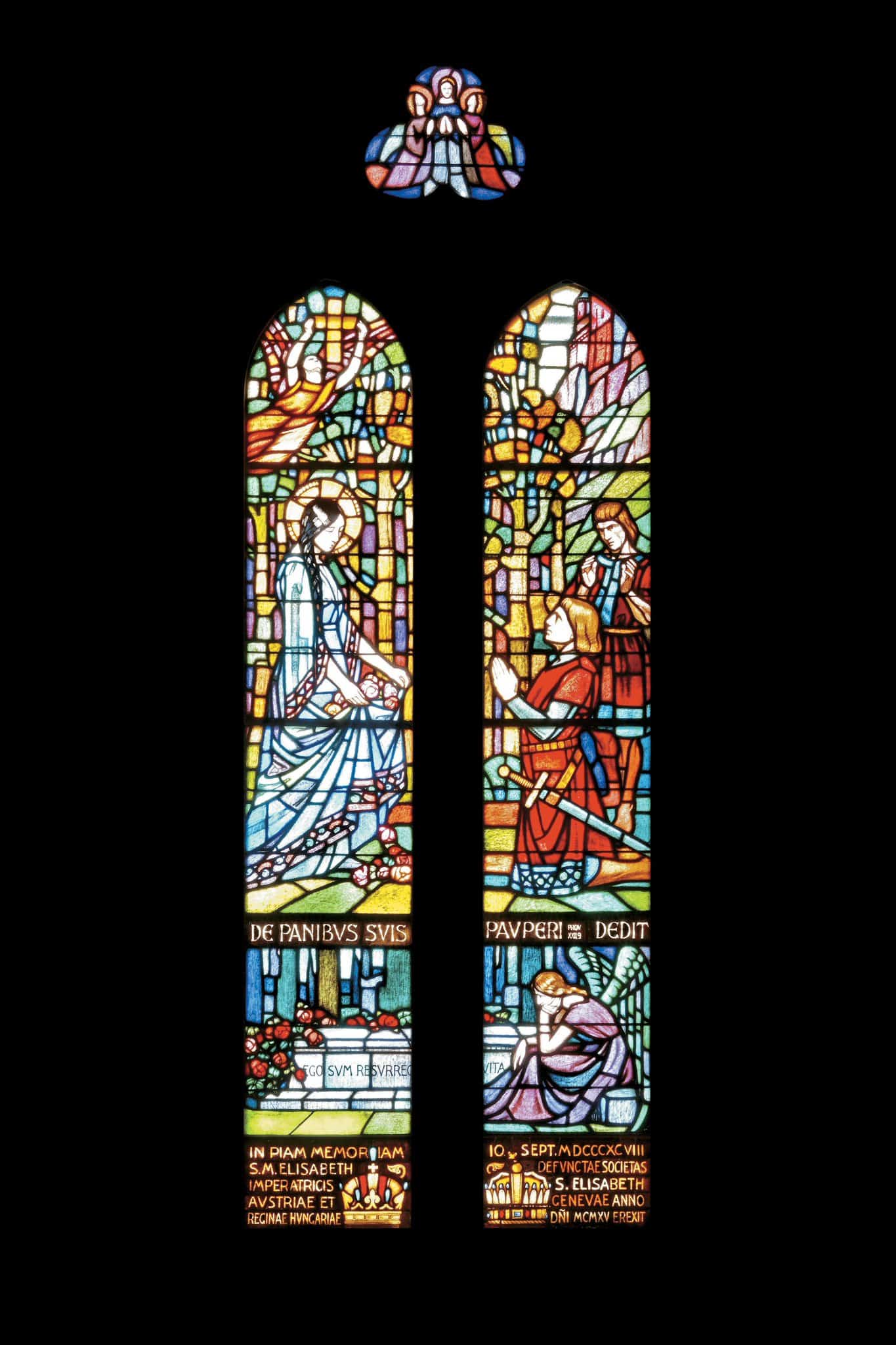 DE PANIBVS SVIR (cartouche sous Elisabeth) // PAVPERI / PROV / XXII.9. DEDIT (cartouche sous le chevalier) // EGO SUM RESURECTIO // ET VITA (sur le tombeau) // IN PIAM MEMORIAM / S.M. ELISABETH IMPERATRICIS / AVSTRIAE ET / REGINAE HVNGARIAE / (lancette de gauche, cartouche) / 10 SEPT. MDCCCXCVIII / DEFVNCTAE SOCIETAS / S. ELISABETH / GENEVAE ANNO / DNI MCMXV EREXIT (lancette de droite, cartouche)