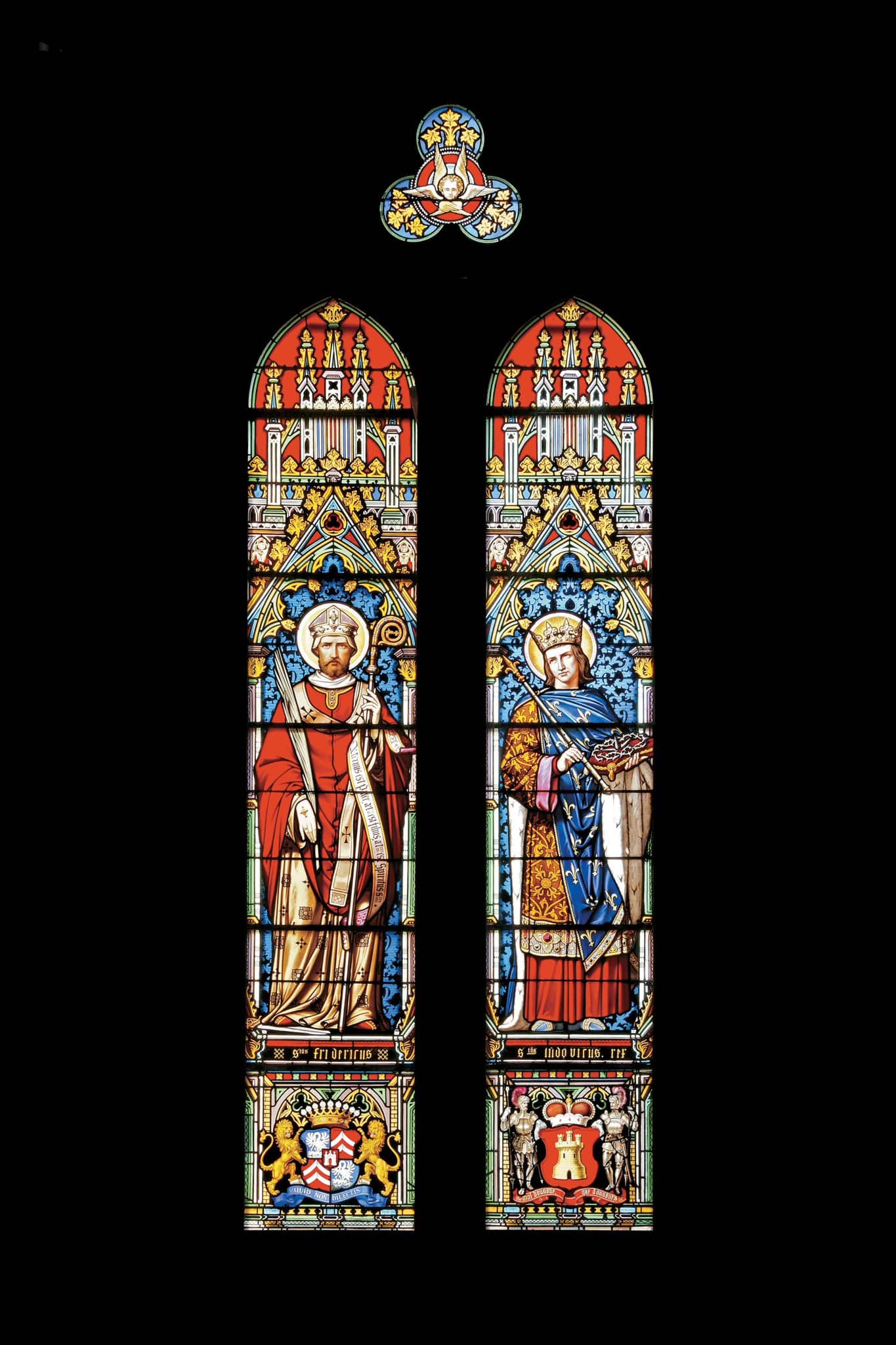 Sur la lancette de gauche, saint Frédéric tient la palme du martyre et sa crosse d’évêque. Il foule une épée, instrument de son supplice. En dessous, les armoiries du donateur. Sur la lancette de droite, saint Louis tient son sceptre et la couronne d’épines. En dessous, les armoiries du donateur.