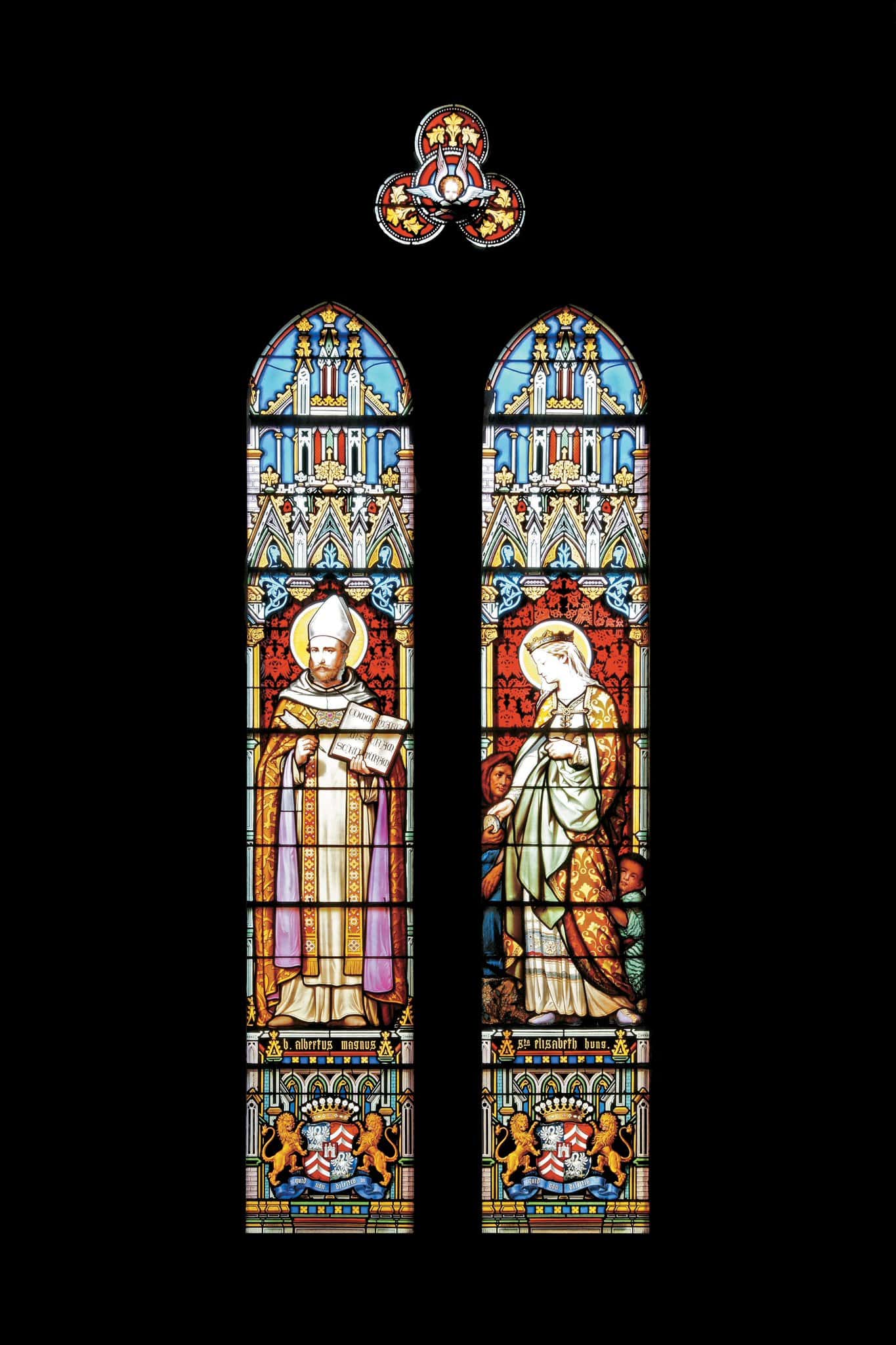 Sur la lancette de gauche, Albert le Grand, habillé en évêque, tient un livre ouvert et une plume. Sur la lancette de droite, Elisabeth de Hongrie distribue du pain aux pauvres. En-dessous des deux lancettes, les armoiries du donateur