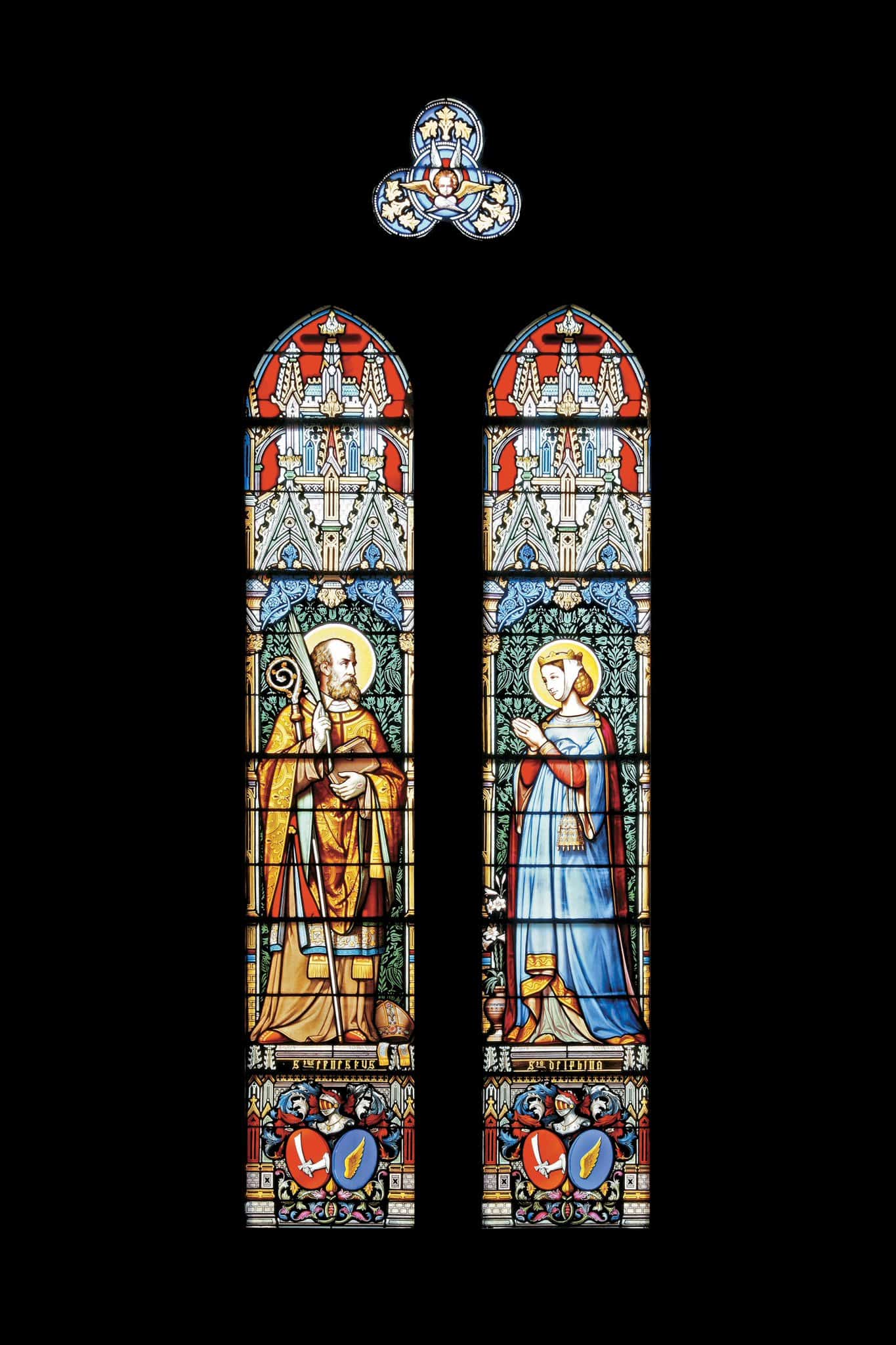 Sur la lancette de gauche, saint Ernest, vêtu en abbé, tient la crosse épiscopale et la palme du martyre. En-dessous, les armoiries du donateur. Sur la lancette de droite, sainte Delphine en prière, des lys blancs à ses pieds.