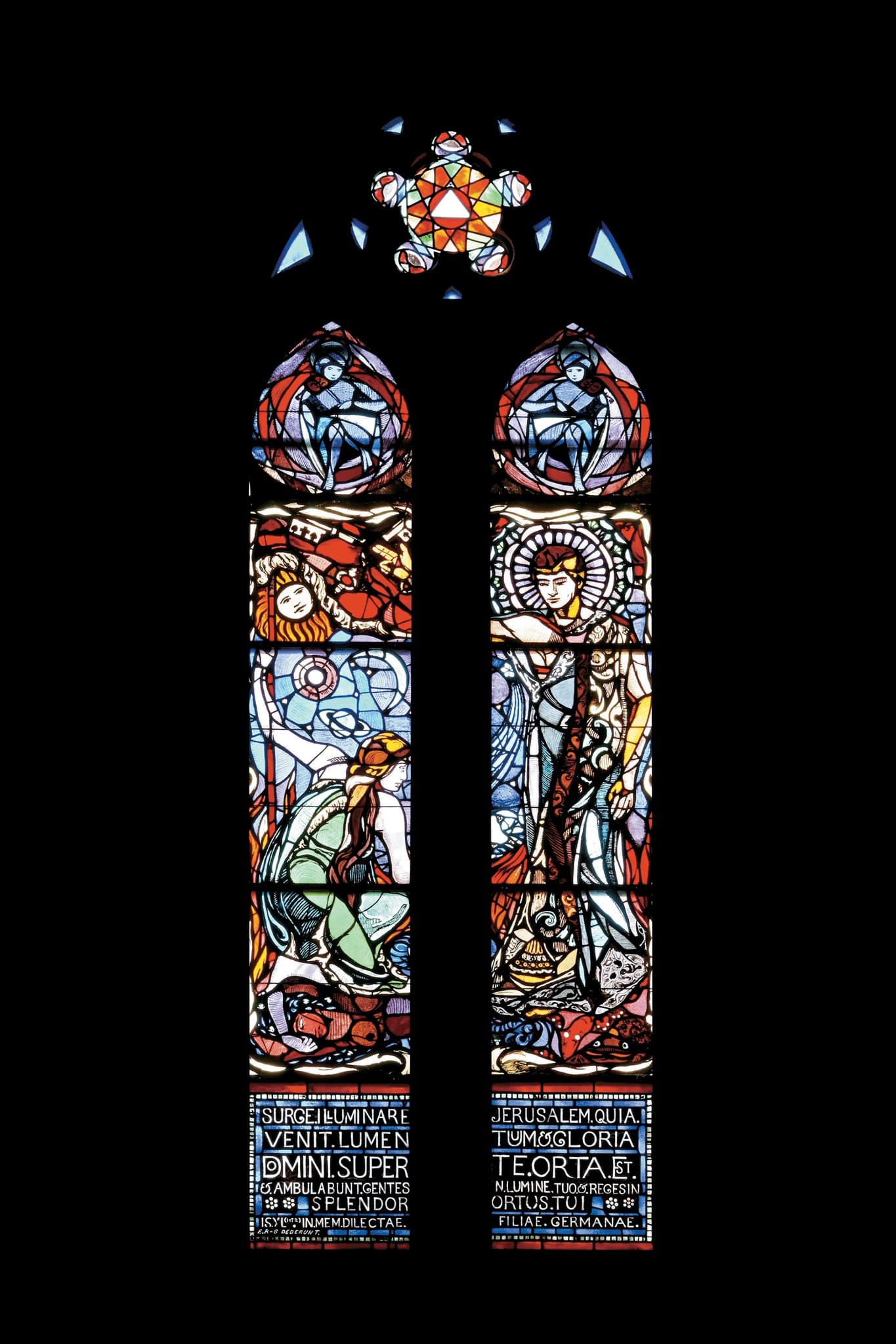 SURGE ILLUMINARE // JERUSALEM QUIA // VENIT LUMENT // TUUM & GLORIA // DOMINI SUPER // TE ORTA EST // & AMBULABUNT GENTES // IN LUMINE TUO & REGESIN // SPLENDOR // ORTUS TUI // (Isaïe, 50) (sous la scène texte continu d’une lancette à l’autre) ISYL IN MEM. DILECTAE // FILIAE GERMENAE // E.R.-G. DEDERUNT (lancette de gauche en bas à gauche)