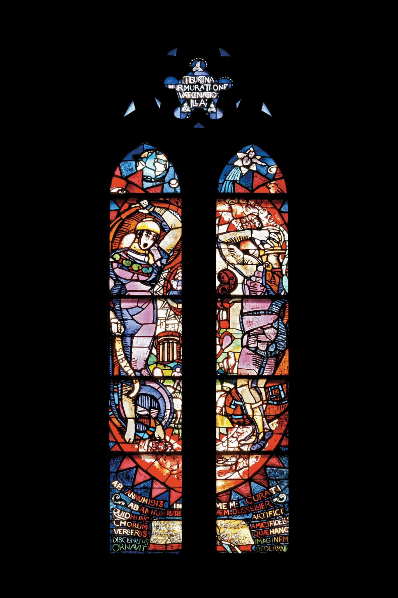 Sur la lancette de gauche, la terre. En-dessous, la Sybille tiburtine devant un paysage romain. Sur la lancette de droite, une comète. En-dessous, César en armure