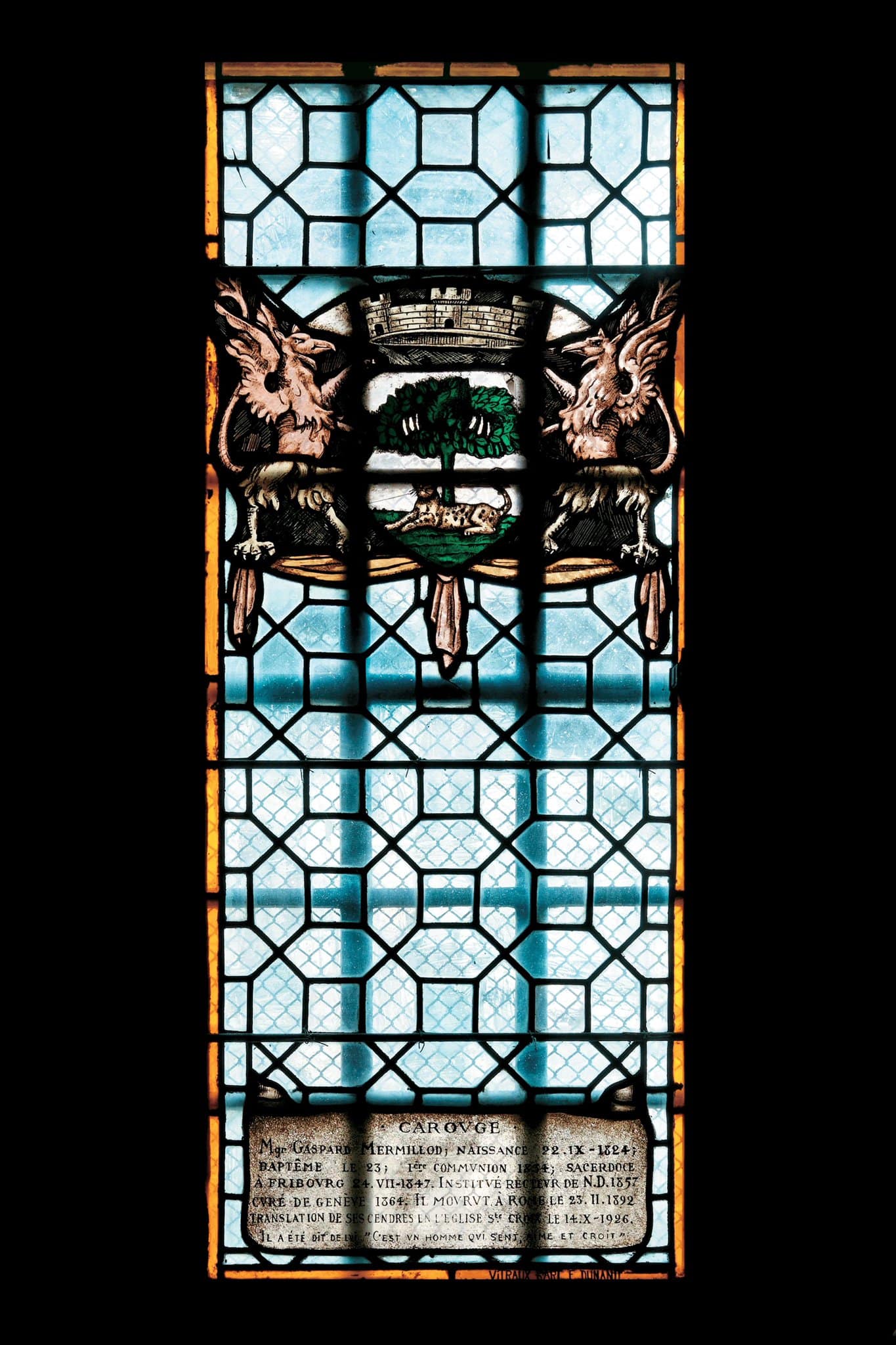 CAROUGE / MGR. GASPARD MERMILLOD; NAISSANCE 22.IX-1824; / BAPTÊME LE 23; Ière COMMVNION 1834; / SACERDOCE / A FRIBOVRG 24.VII-1847. INSTITVE RECTEUR DE N.D. 1857 / CVRE DE GENEVE 1864. IL MOURUT A ROME LE 23.II.1892 / TRANSLATION DE SES CENDRES EN L’EGLISE Ste CROIX LE 14.IX-1926. / IL A ETE DIT DE LUI “C’EST UN HOMME QUI SENT, AIME ET CROIT” (cartouche)