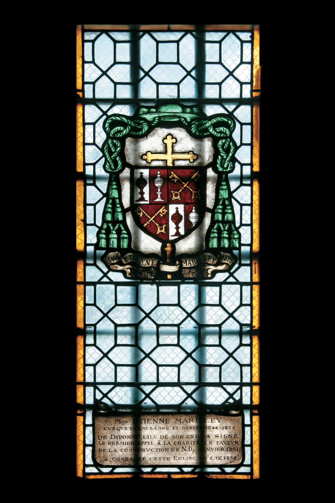 1846 / ETIENNE / MARILLEY 1879 (sous les armoiries) Mgr ETIENNE MARILLEY / EVÊQUE DE LAUSANNE ET GENÈVE 1846-1872 / DE DIVONNE, LIEV DE SON EXIL A SIGNE / LE PREMIER APPEL A LA CHARITE EN FAVEVR / DE LA CONSTRVCTION DE N.D., JANVIER 1851 / A CONSACRE CETTE EGLISE, LE 8.IX 1859 (cartouche)