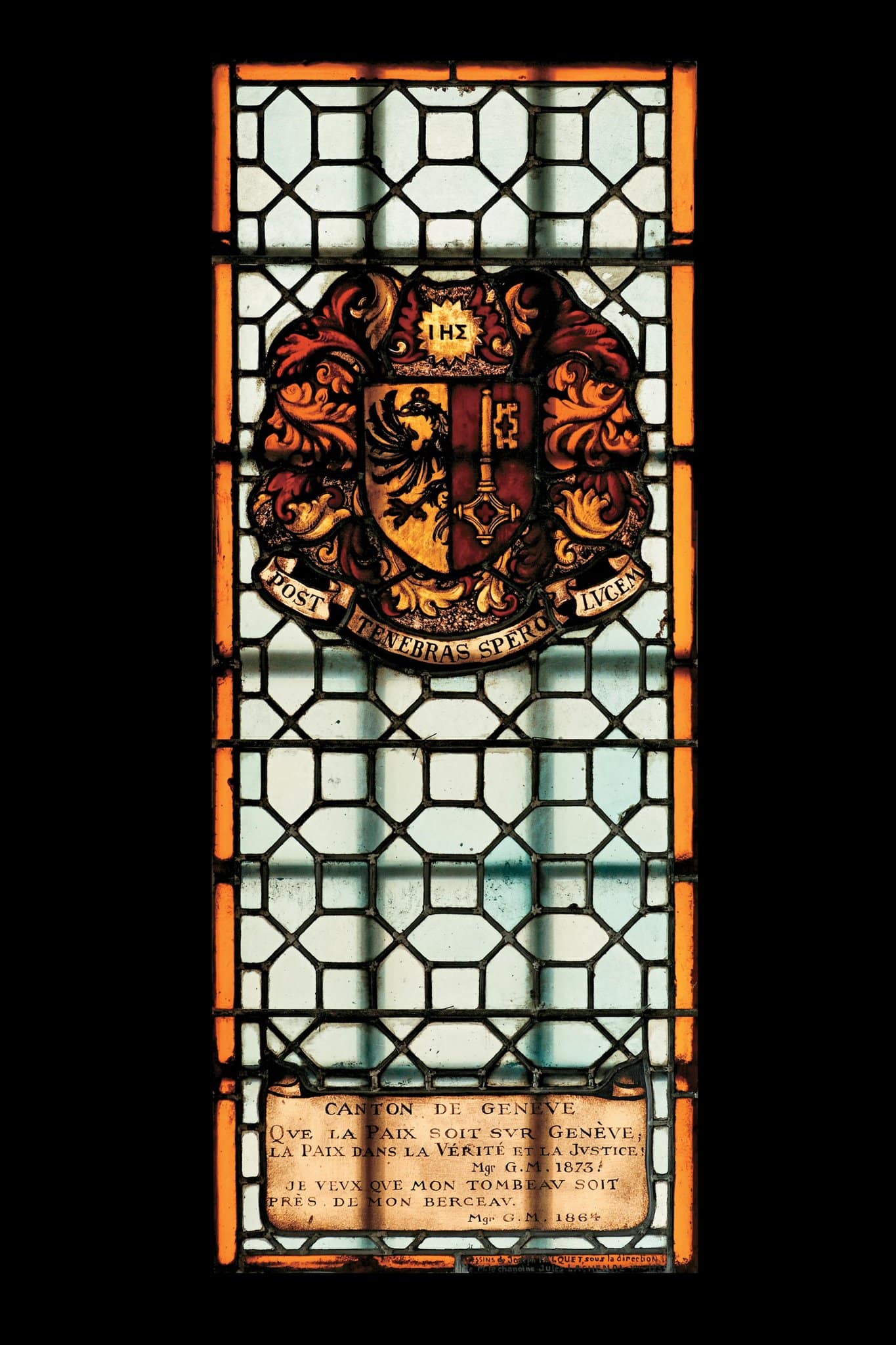 POST TERRAS SPERO LVGEM (sous les armoiries) CANTON DE GENEVE / QVE LA PAIX SOIT SVR GENEVE, / LA PAIX DANS LA VERITE ET LA JVSTICE ! / Mgr G.M. 1873 / JE VEVX QVE MON TOMBEAU SOIT / PRES DE MON BERCEAV. / Mgr G.M. 1864 (cartouche)