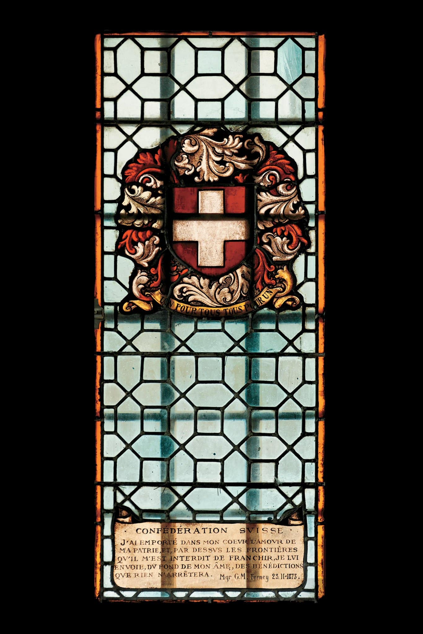 (UN) POUR TOUS TOUS (PO)UR UN (sous les armoiries) CONFEDERATION SVISSE / J’AI EMPORTE DANS MON COEVR L’AMOVR DE / MA PATRIE, ET, PAR DESSVS LES FRONTIERES / QV’IL M’EST INTERDIT DE FRANCHIR, JE LVI / ENVOIE, DV FOND DE MON ÂME, DES BENEDICTIONS / QUE RIEN N’ARRÊTERA. / MGR G.M. FERNEY 23.II-1873 (cartouche)