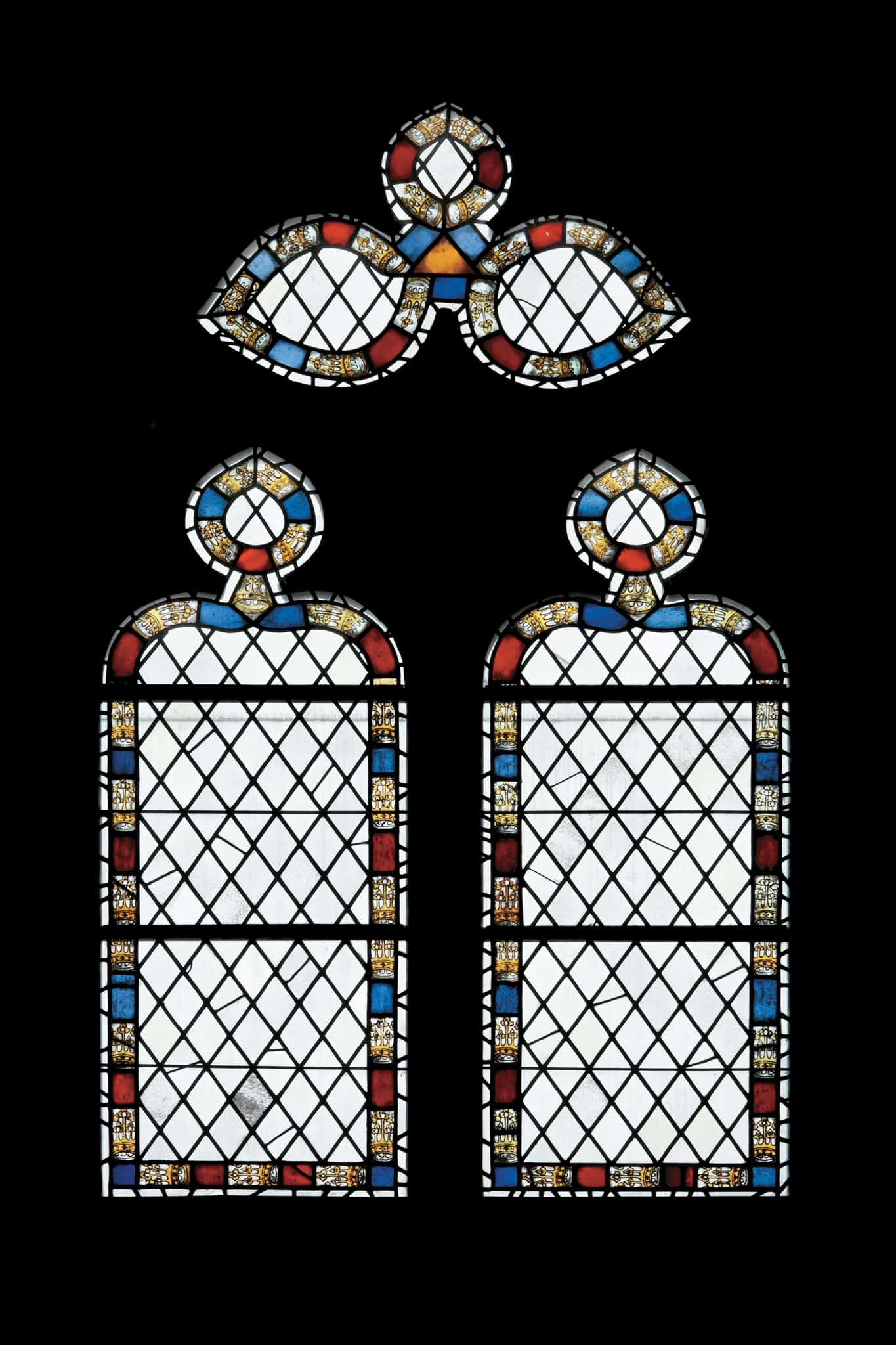 Fenêtre à losanges encadrée d’une bordure décorative.