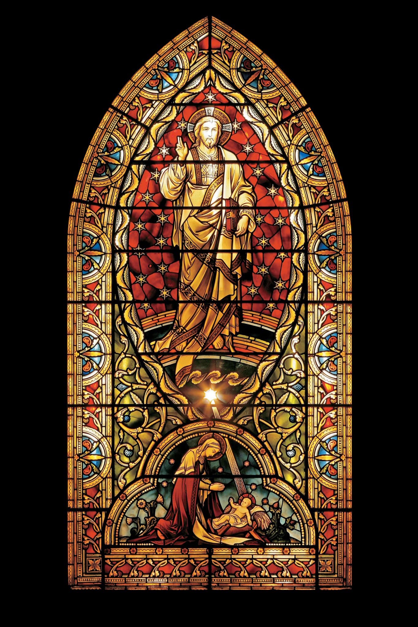 En haut, sur un fond étoilé rouge, le Christ est en gloire dans une mandorle. En bas, la Vierge, agenouillée, est en prière devant l’Enfant Jésus couché dans sa mangeoire.